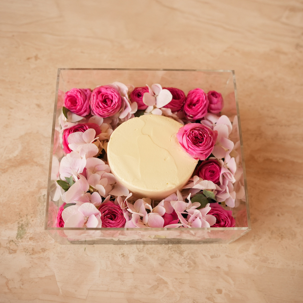 باقة تحتوي على زهور البيبي جوري والهايدرينجا الوردية، مرتبة بشكل جميل في صندوق مع كيكة بينتو مخبوزة.