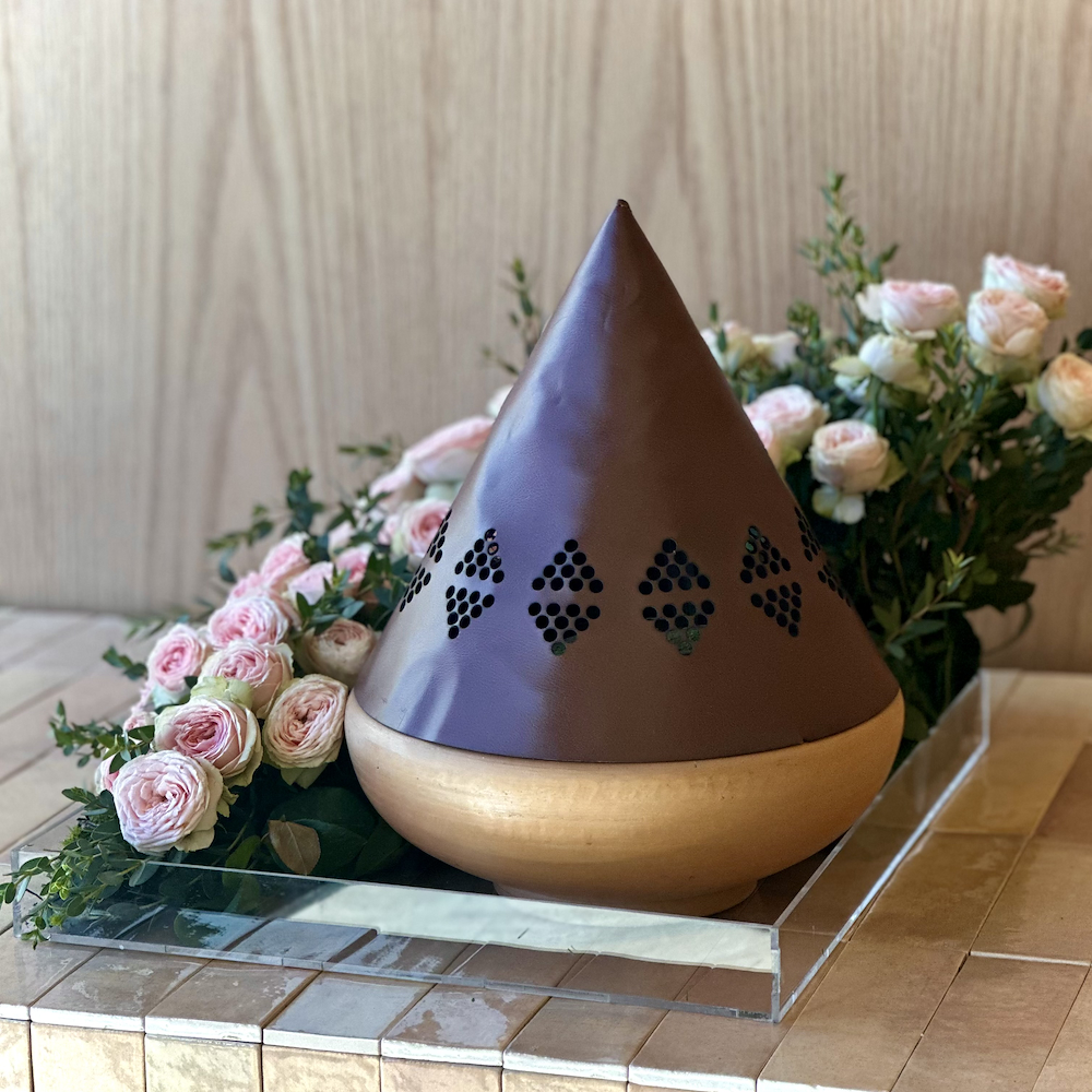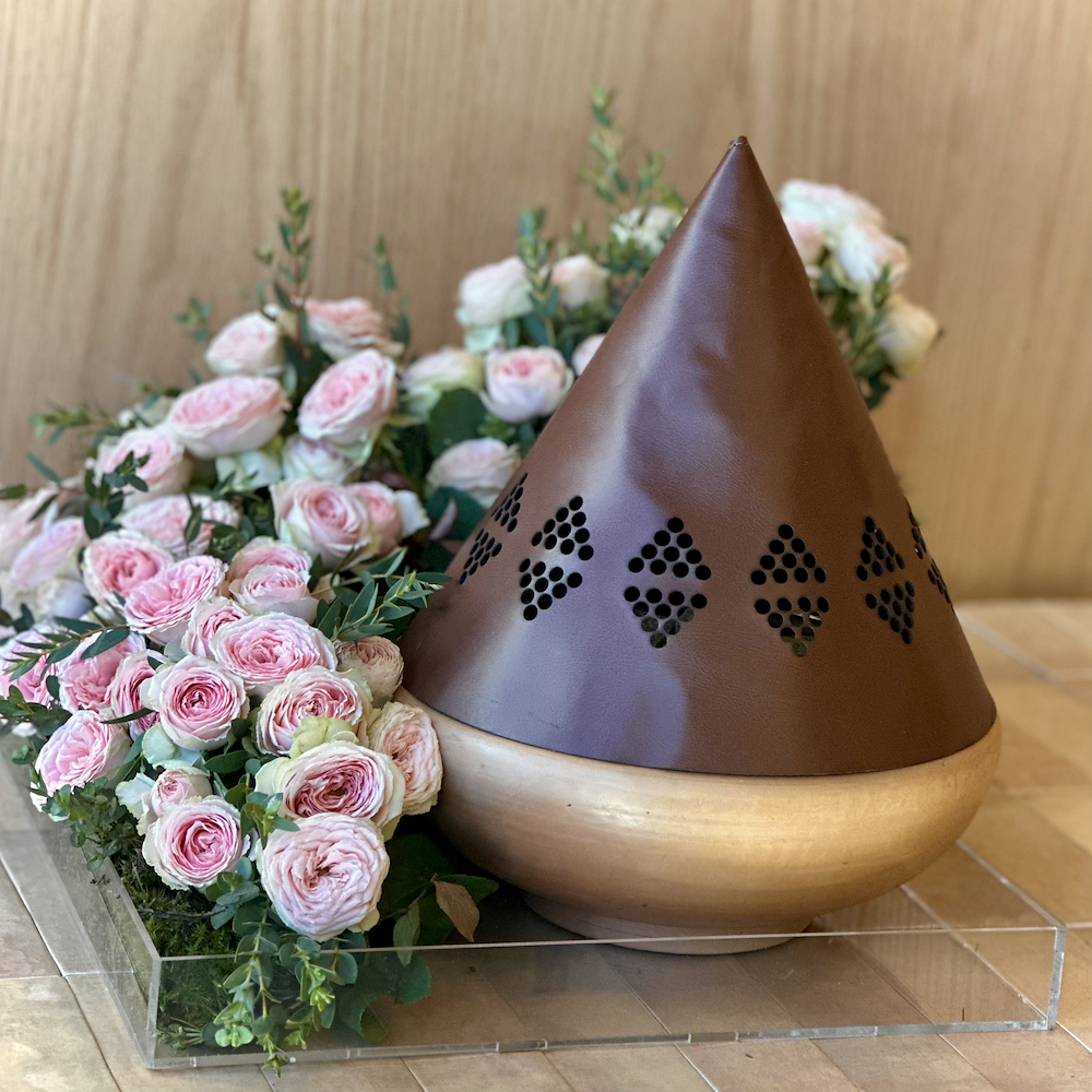 صينية مليئة بأزهار البيبي روز وطبق خزفي مصنوع يدويا مع غطاء جلدي من الرنجينه.