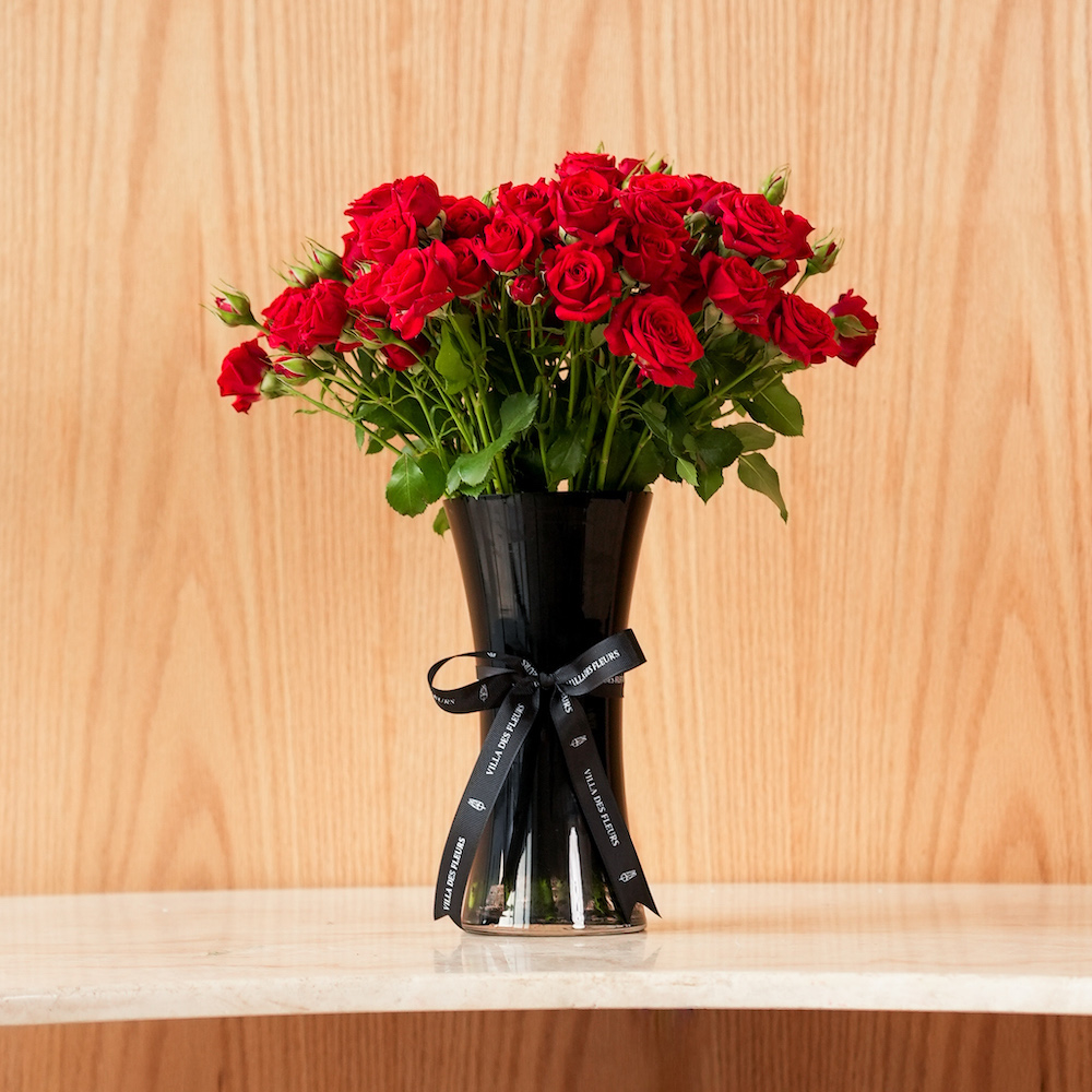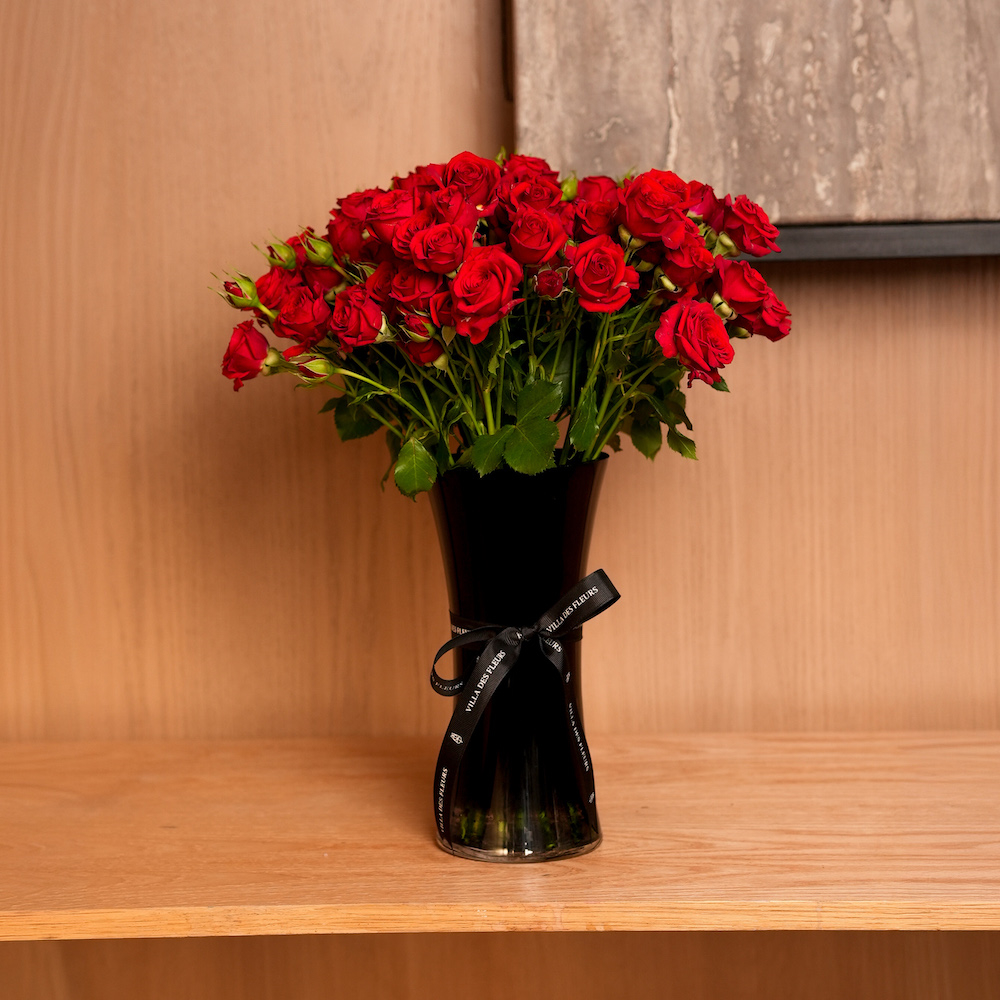 باقة تحتوي على زهور الجوري الحمراء، مرتبة بشكل جميل في فازة أسطوانية سوداء.