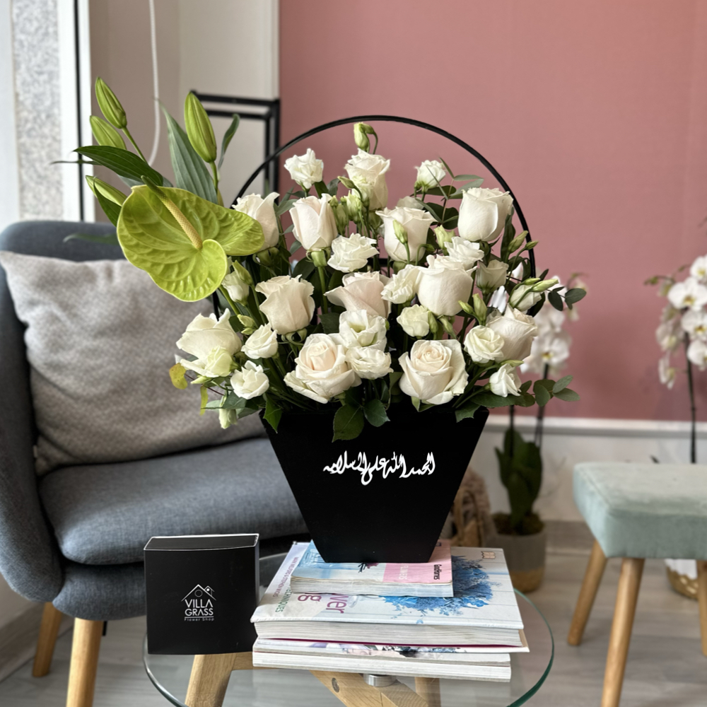 باقة جميلة تتكون من زهور الجوري واليوستوما والليليوم والانثيريوم مع الشوكولاتة.