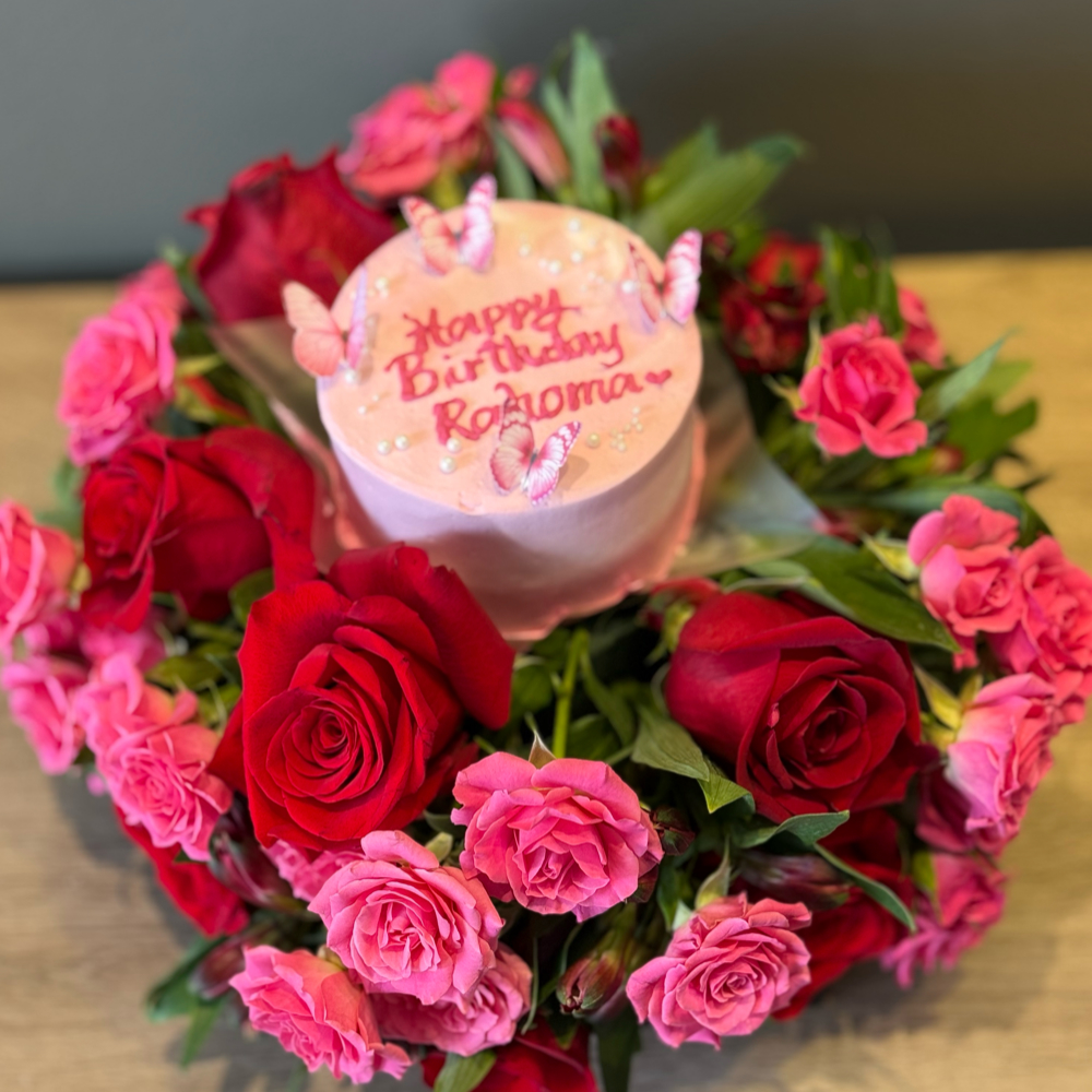 باقة تحتوي على زهور الجوري وبيبي جوري مع كيكة لذيذة وجميلة.