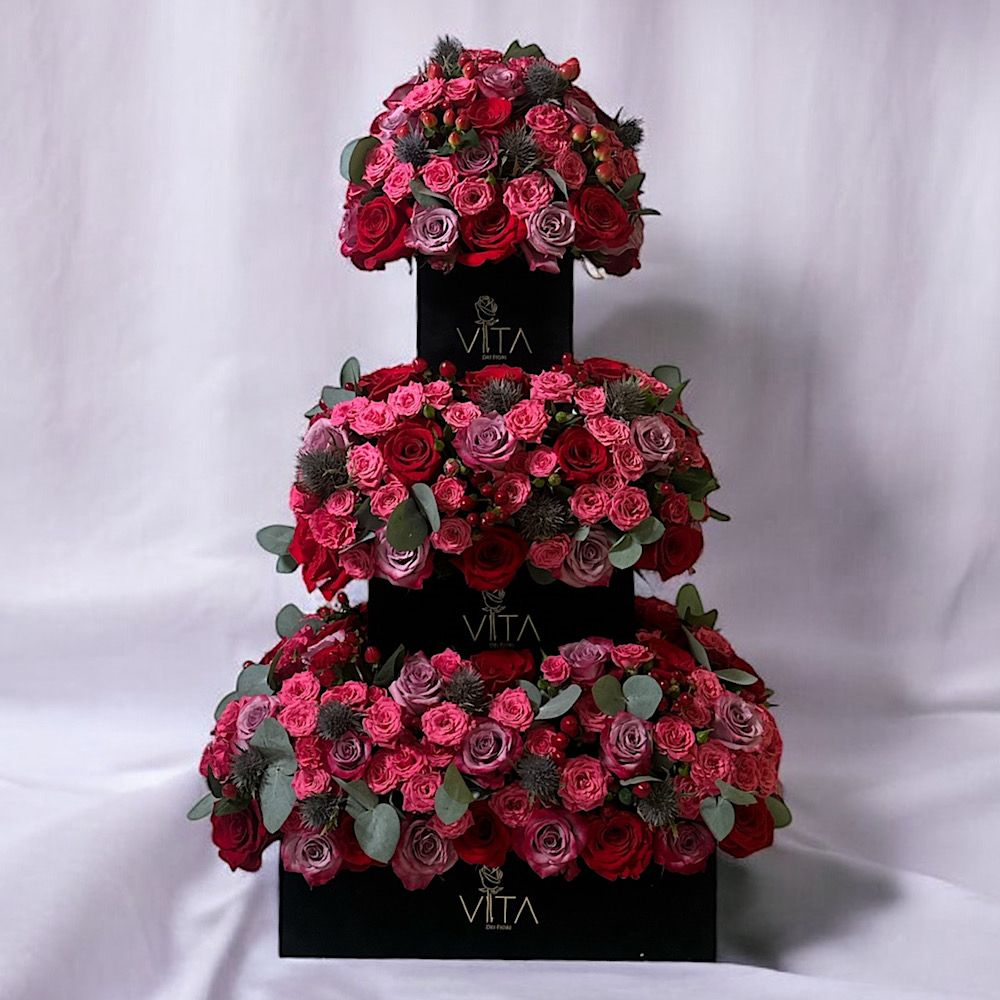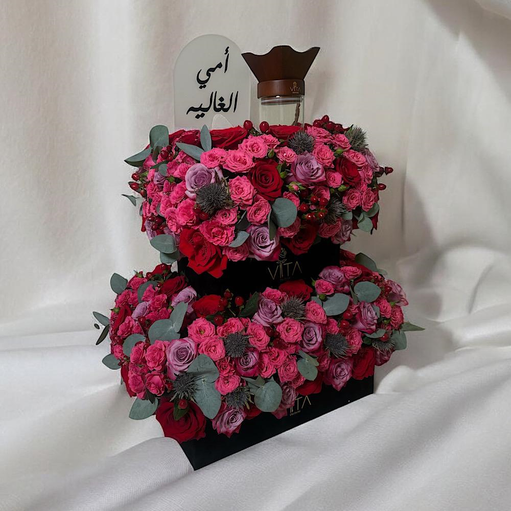 صينية بيضاء تحتوي على بيبي جوري، جوري وهايبريكوم مع كيكة.