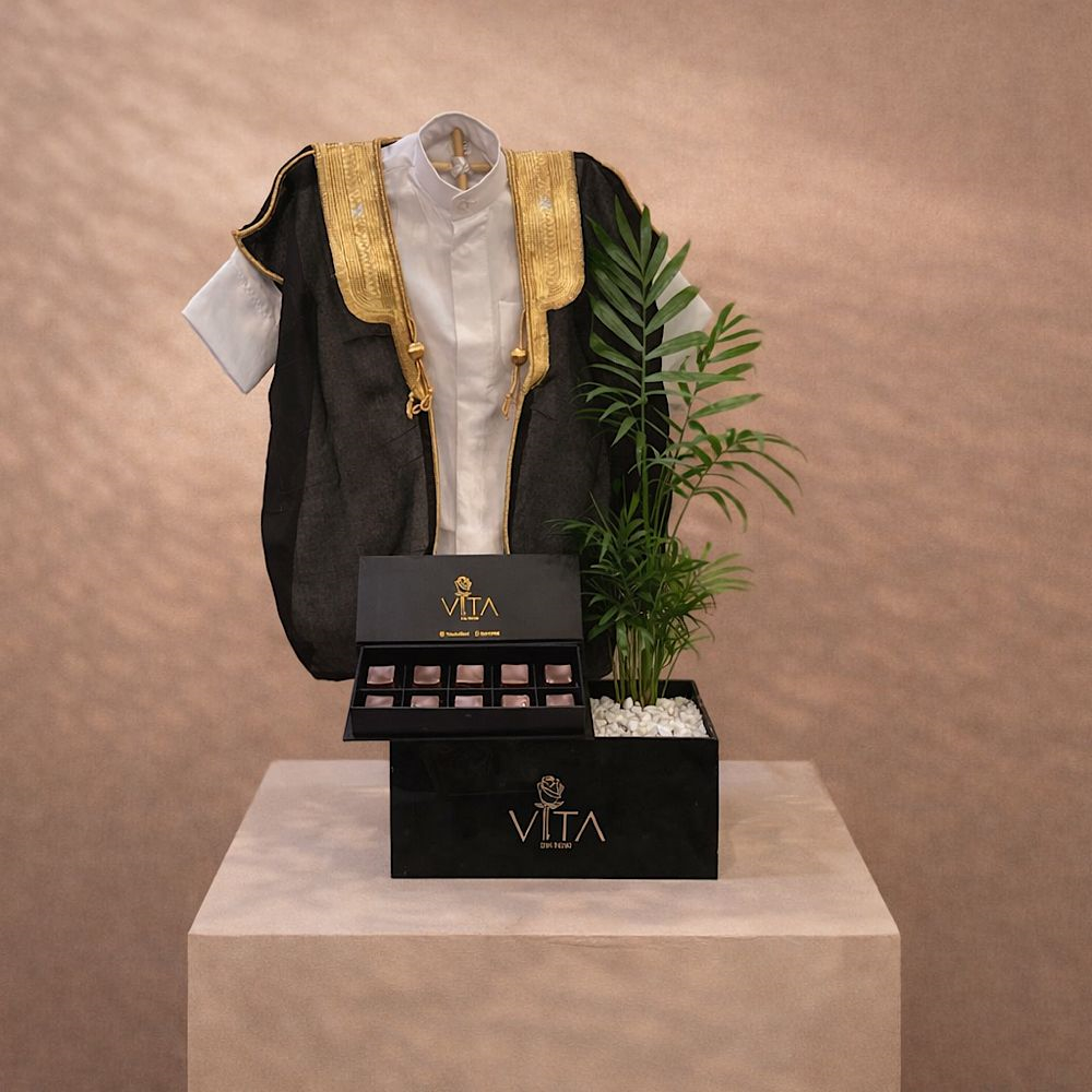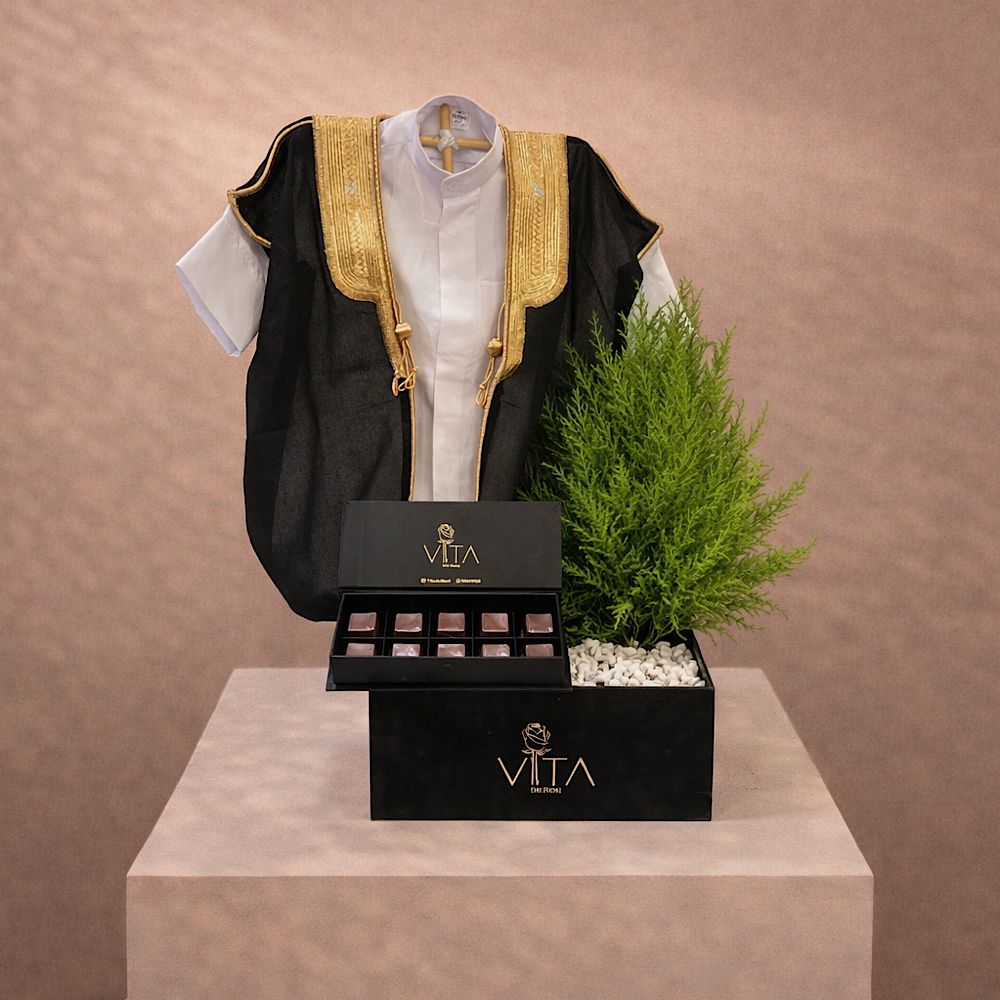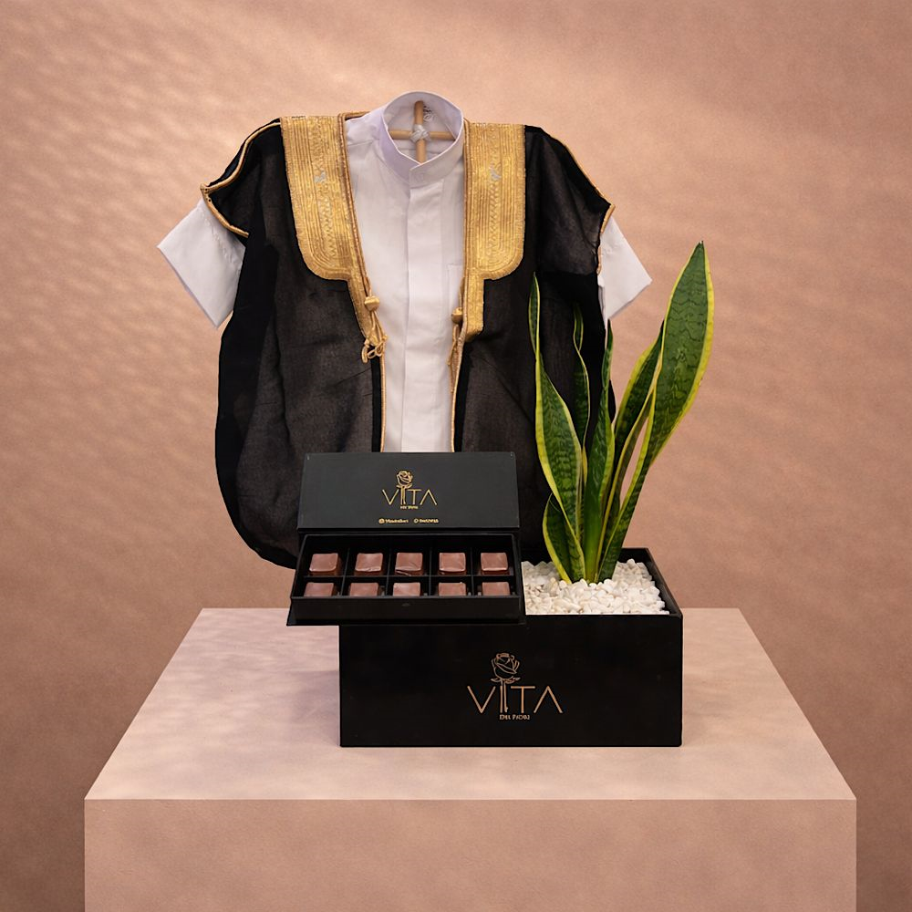 يحتوي الصندوق الأسود على نبتة الثعبان مع فستان للطفلة الصغيرة وعلبة شوكولاتة.