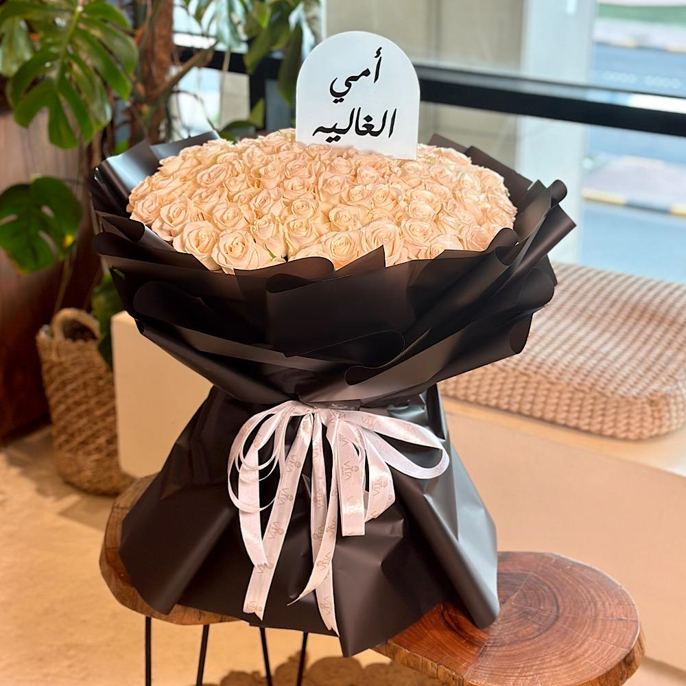 هذه الباقة تحتوي على 100 زهرة جوري بيضاء.
