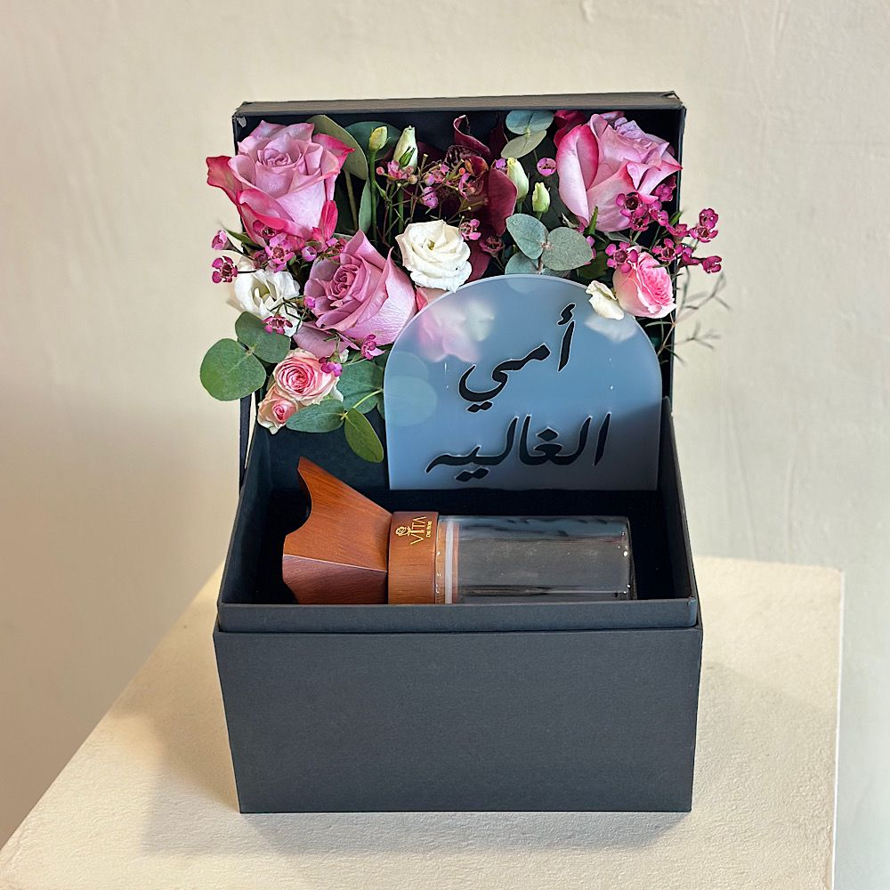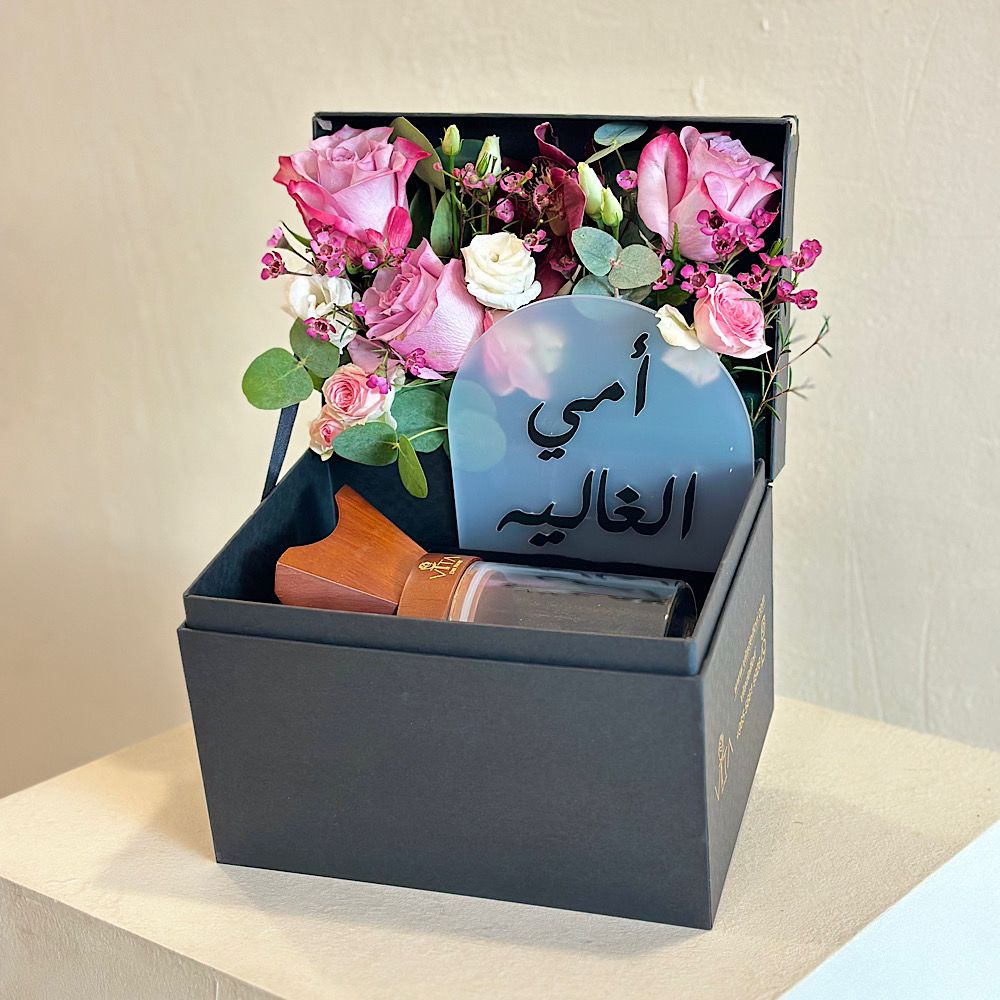 علبة سوداء تحتوي على مبخر وتولة من بخور السيوفي، مزينة بزهور الجوري، الإستوما، السمبيديوم، زهور الواكس، والأوراق الخضراء، مع زينة خاصة بيوم الأم.