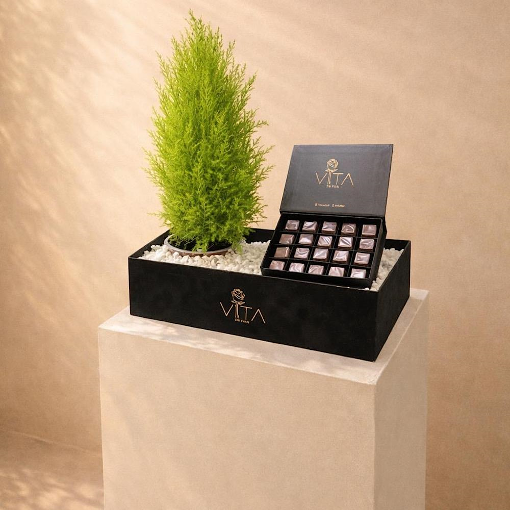 باقة تحتوي على نبتة وعلبة شوكولاتة.
