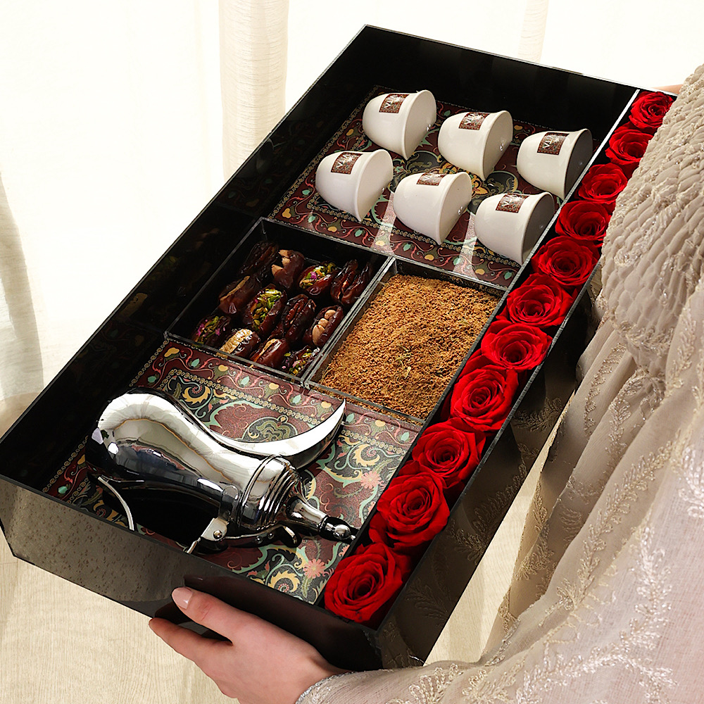 باقة تحتوي على زهور الجوري الحمراء مع 250 جرام من القهوة العربية، 6 فناجين قهوة، دلة قهوة عربية والتمر المحشي، مرتبة بشكل جميل في علبة.