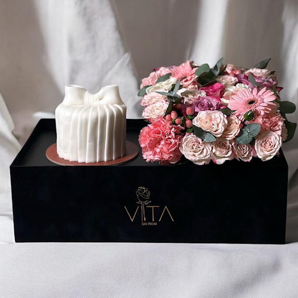 علبة من الأكريليك تحتوي على زهور الجوري، البيبي أوركيد والكريز مع كيكة المرآة.