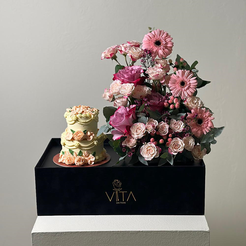علبة سوداء تحتوي على جوري بنفسجية داكنة، وجربيرا، وجوري وردية، وجوري صغيرة وردية، وزهور شمعية بنفسجية، وزهور هايبريكوم وردية، وأوراق أوكالبتوس. تأتي مع كيكة من طبقتين.