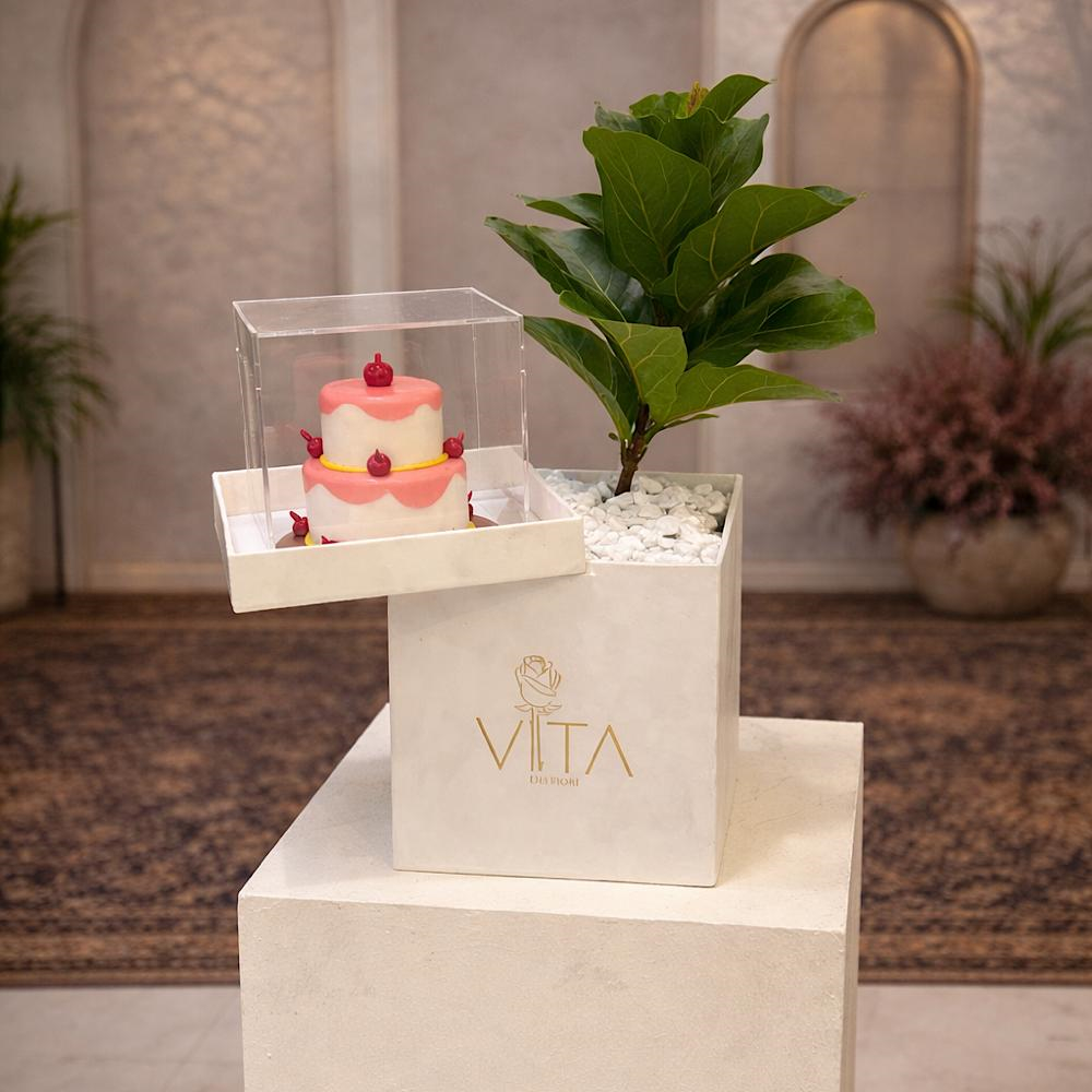يحتوي هذا البوكس الأبيض على نبات فيدل ليف فيج، بتصميم جميل مع كيكة.