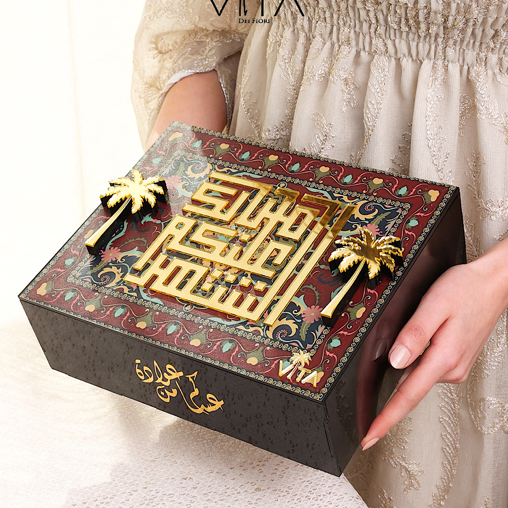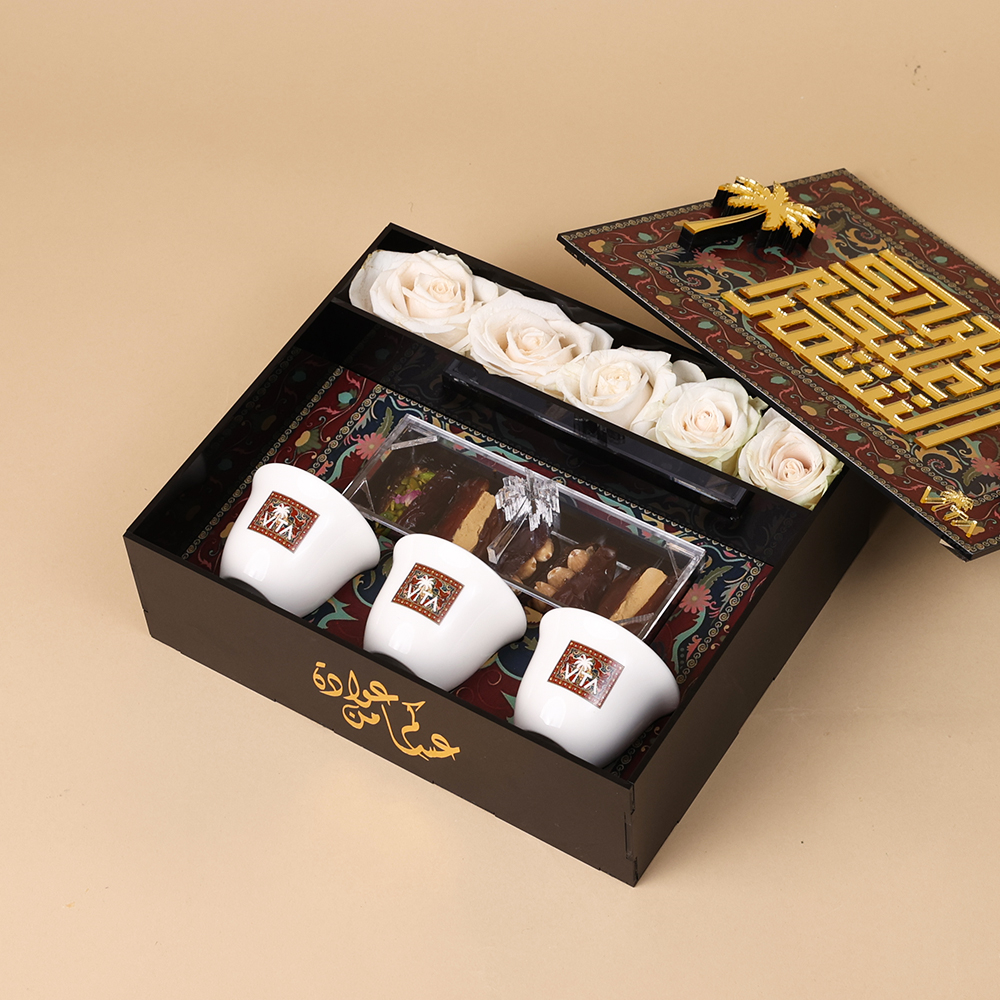 باقة تحتوي على زهور الجوري البيضاء مع 6 فناجين قهوة والتمر المحشي، مرتبة بشكل جميل في علبة.