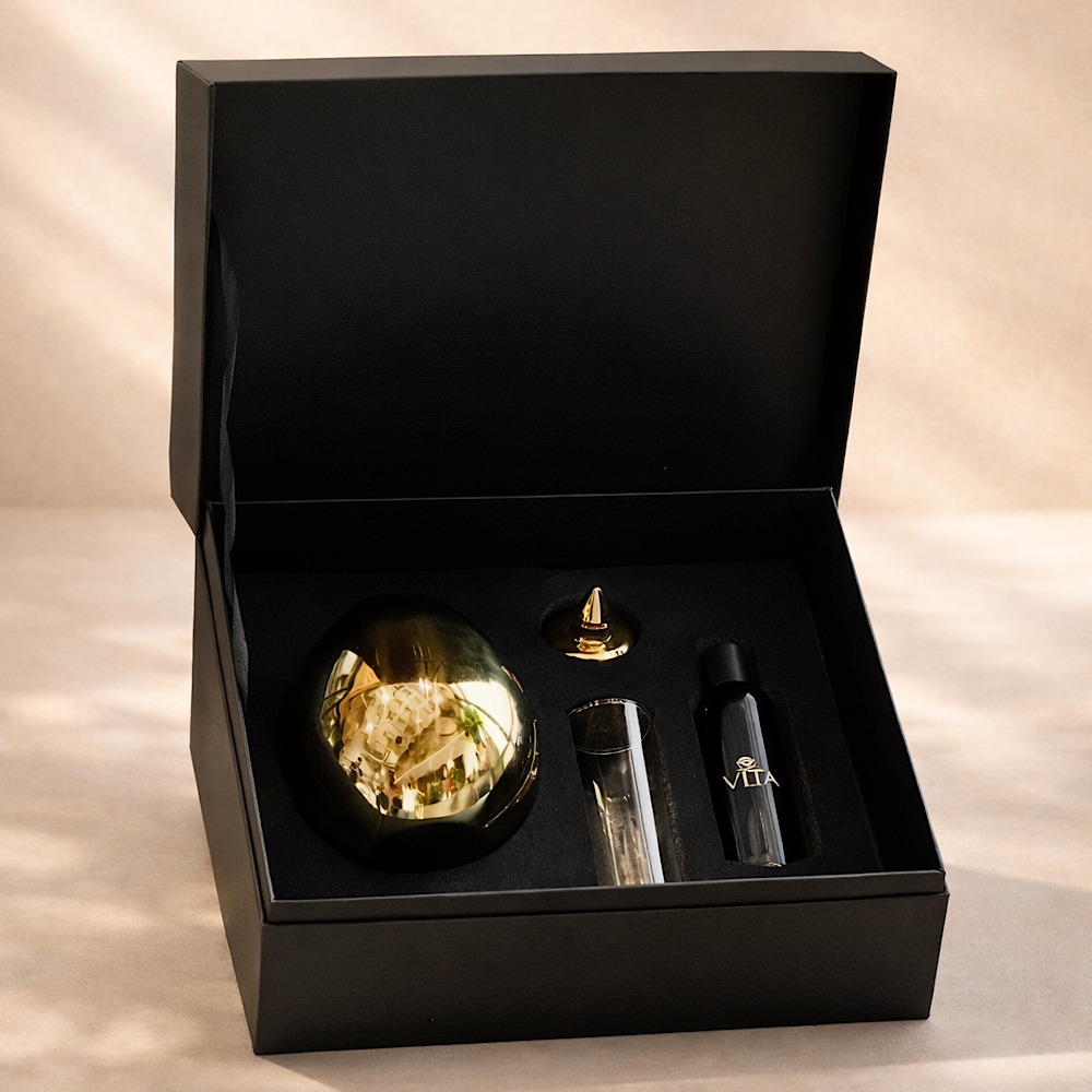 صندوق يحتوي على فواحة بسعة 250 مل مع زيت عطري برائحة سكاندل، مرتب بشكل جميل.