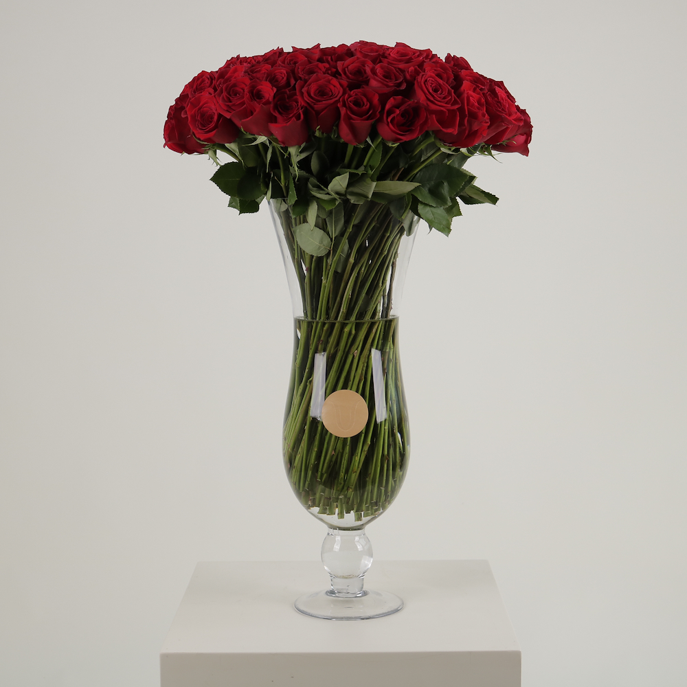 باقة فاخرة من الجوري الأحمر بتصميم أنيق داخل فازة زجاجية طويلة تنبض بالشغف والرقي. تعبير خالد عن الحب والأناقة.