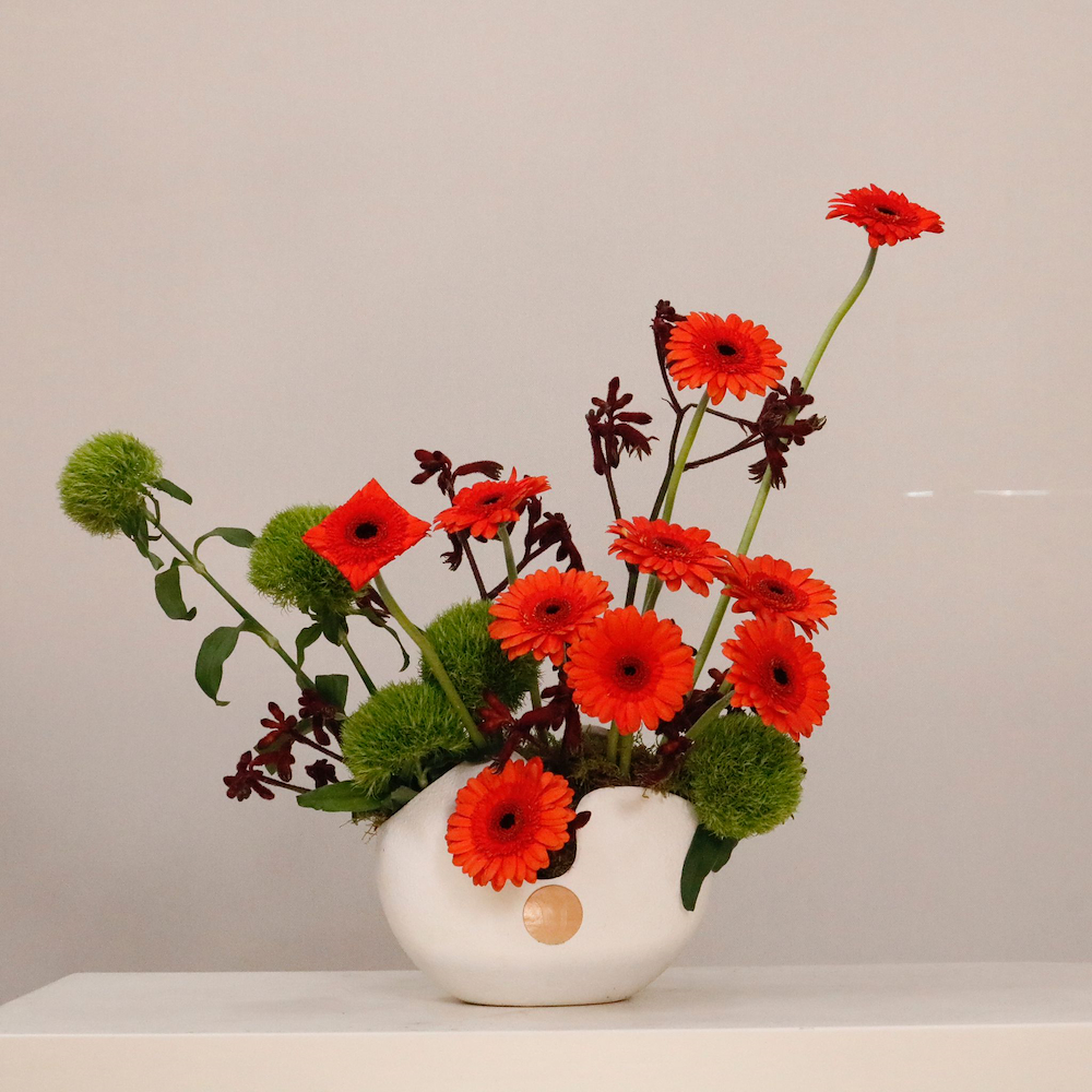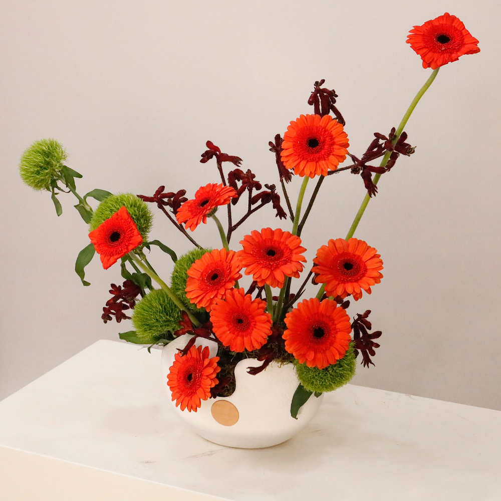 تنسيق عصري مفعم بالحيوية يتكوّن من .زهور الجيربيرا البرتقالية وزهور خضراء نابضة بالحياة في فازة بيضاء أنيقة. يرمز إلى السعادة والتفاؤل، مثالي للهدايا والمناسبات المبهجة.