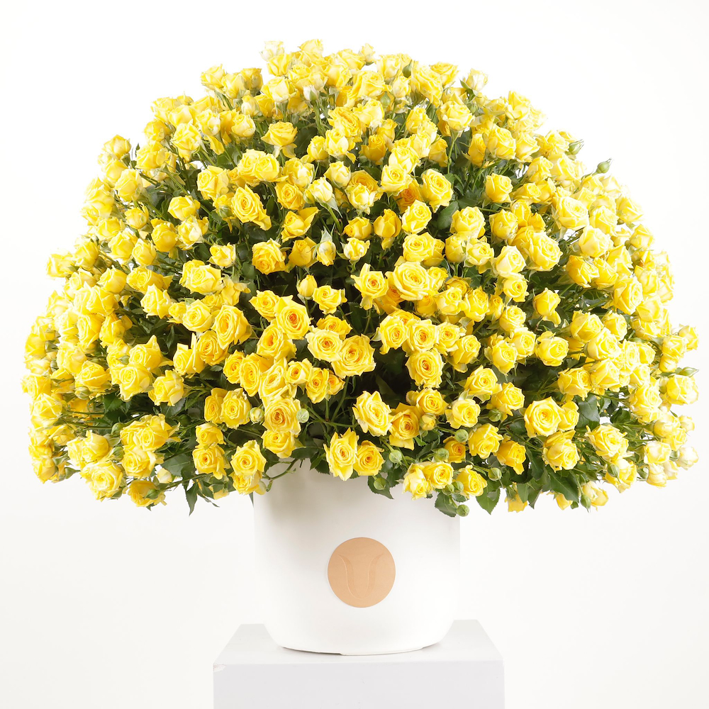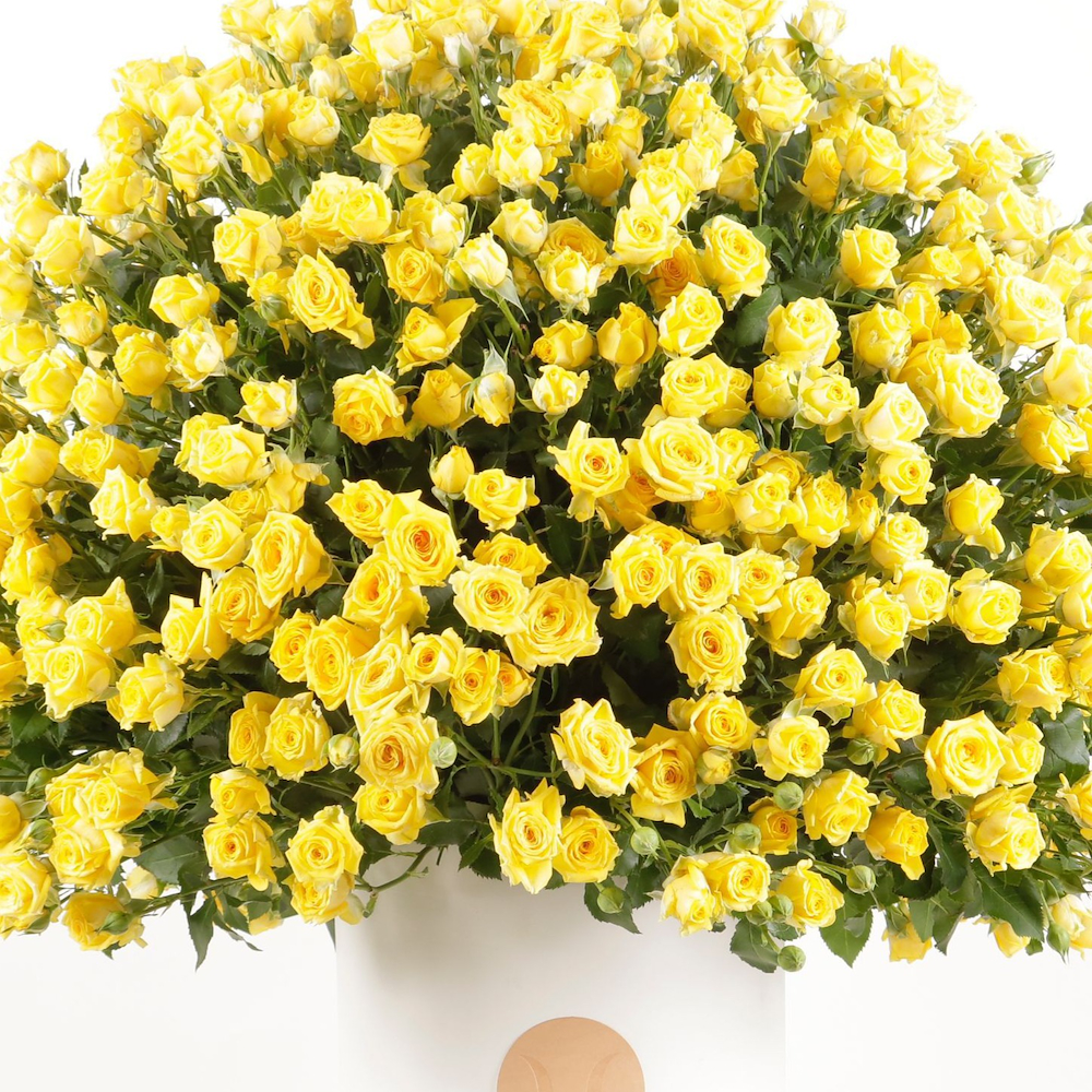 ترتيب فاخر من زهور الجوري الصفراء المشرقة، منسقة بعناية مع خضرة غنية ولمسات دقيقة. كل زهرة تعكس الرقي والدفء، لتصبح قطعة مميزة تجسد الأناقة والجمال الخالد.