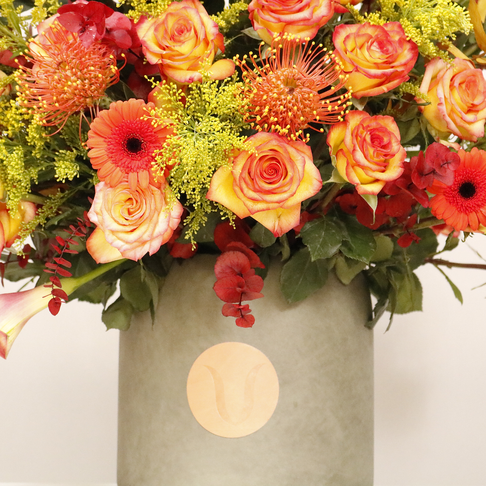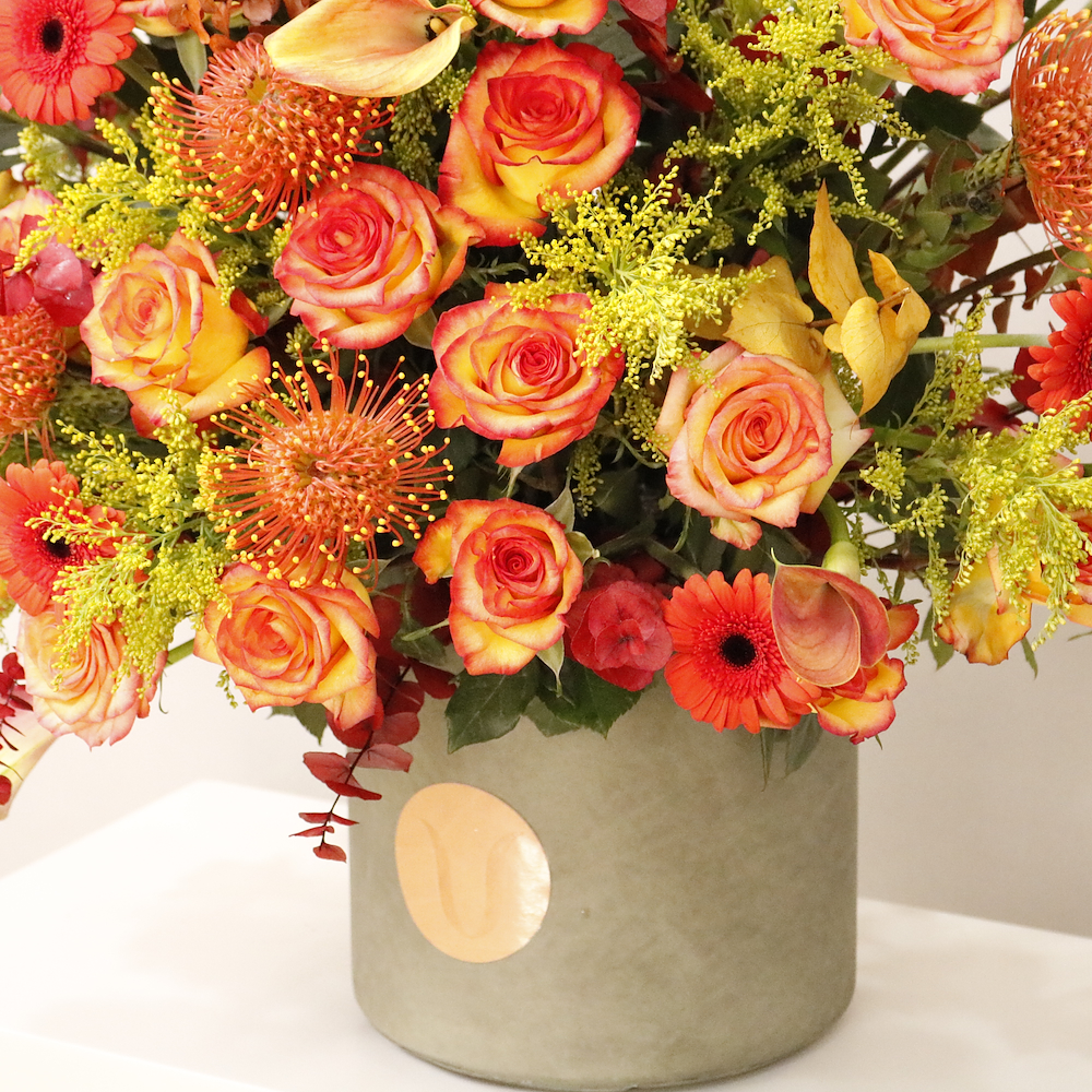 تنسيق فاخر من زهور الجوري، الكالا ليلي والجيربيرا بألوان دافئة تعكس الفخامة والبهجة، مثالي لمناسباتك السعيدة.