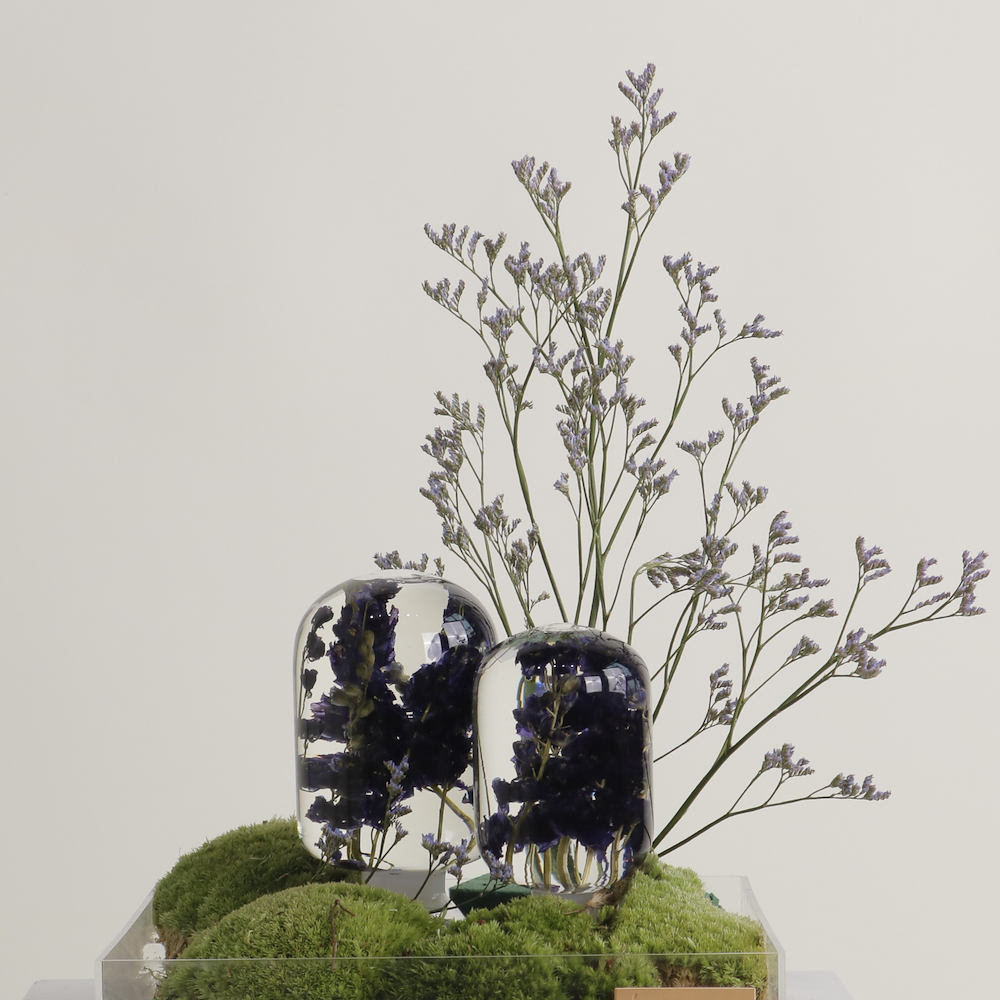 زهور كحلية بأسلوب "جيوم" الكوري، تتألق فوق طبقة غنية من الطحالب الطبيعية. تحفة فنية عصرية تجمع بين دقة التصميم المعماري وسحر الطبيعة المستدامة.