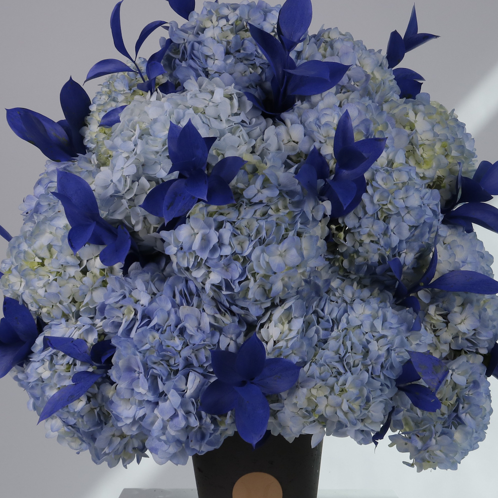 زهور هايدرينجا زرقاء أنيقة بلمسات ملكية، مستوحاة من جمال الفراشة الزرقاء.
