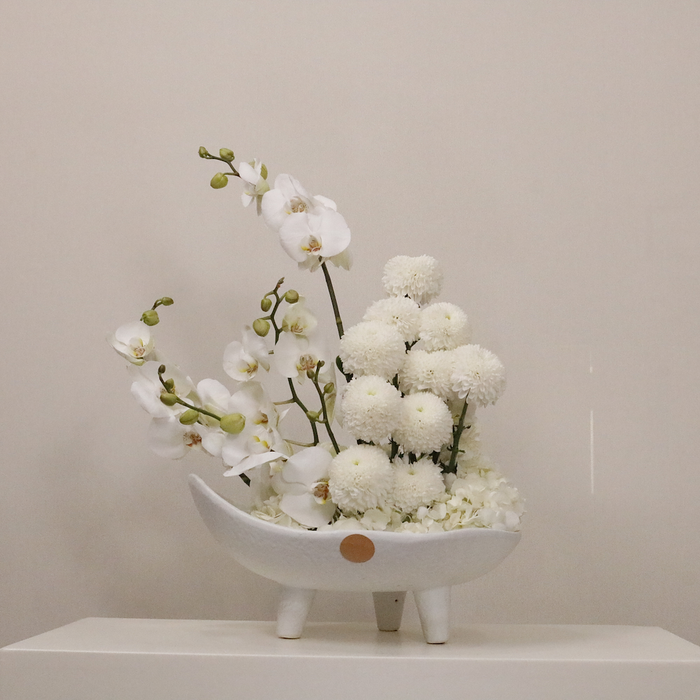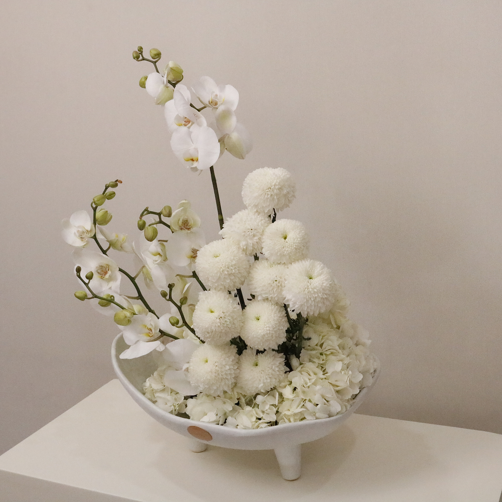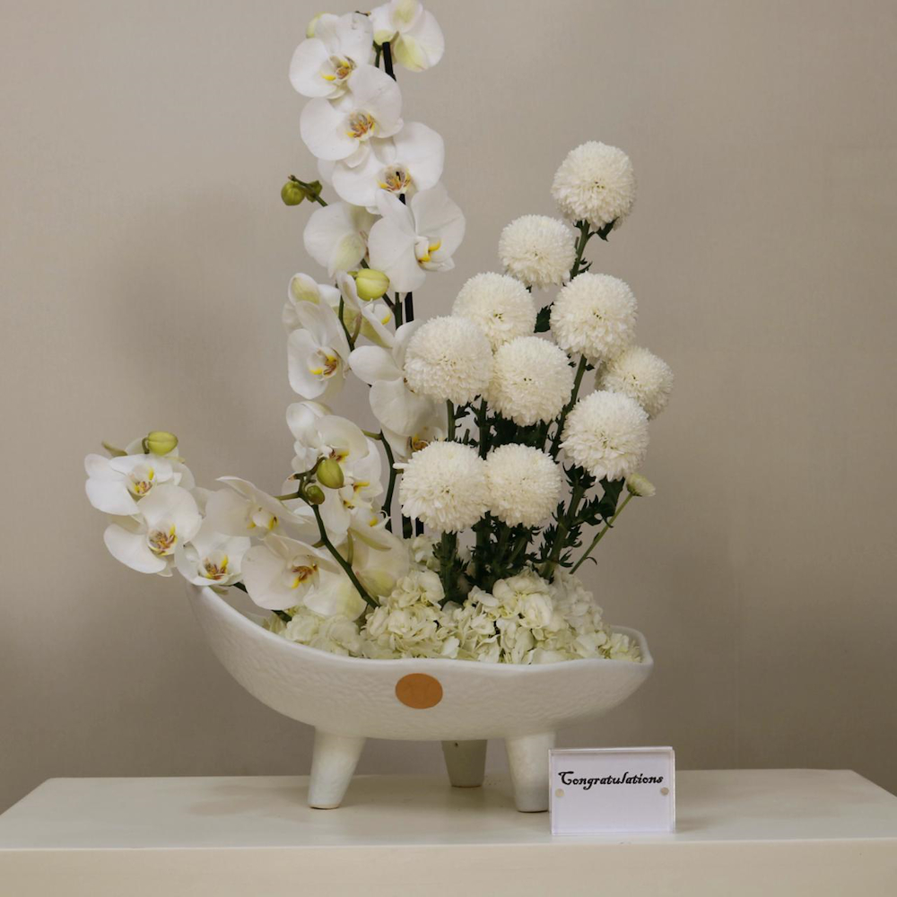 فازة بتصميم مميز مليئة بالأوركيد، زهور الكريز والهايدرنجا.