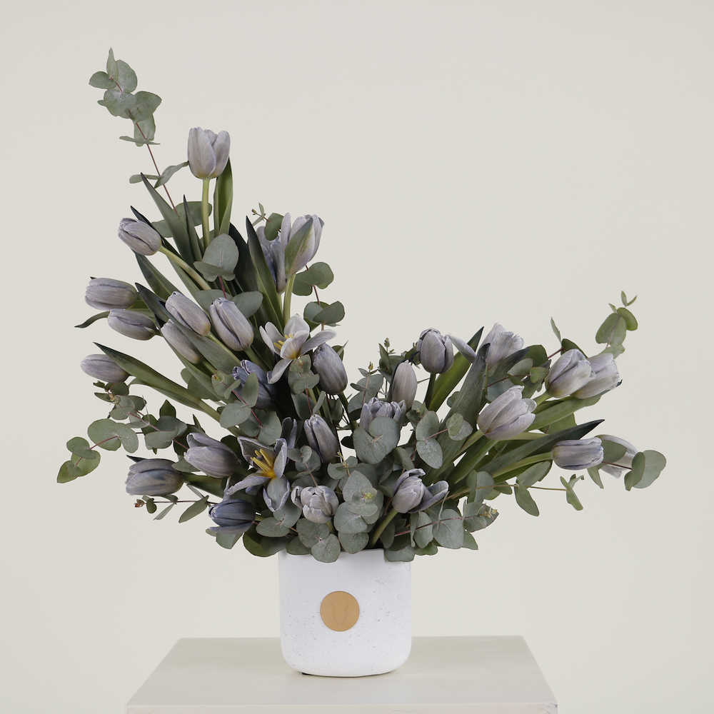 فازة فاخرة من التوليب باللون الأزرق الداكن وأوراق الأوكاليبتوس، يمنح لمسة عصرية فاخرة وبروزاً أنيقاً.