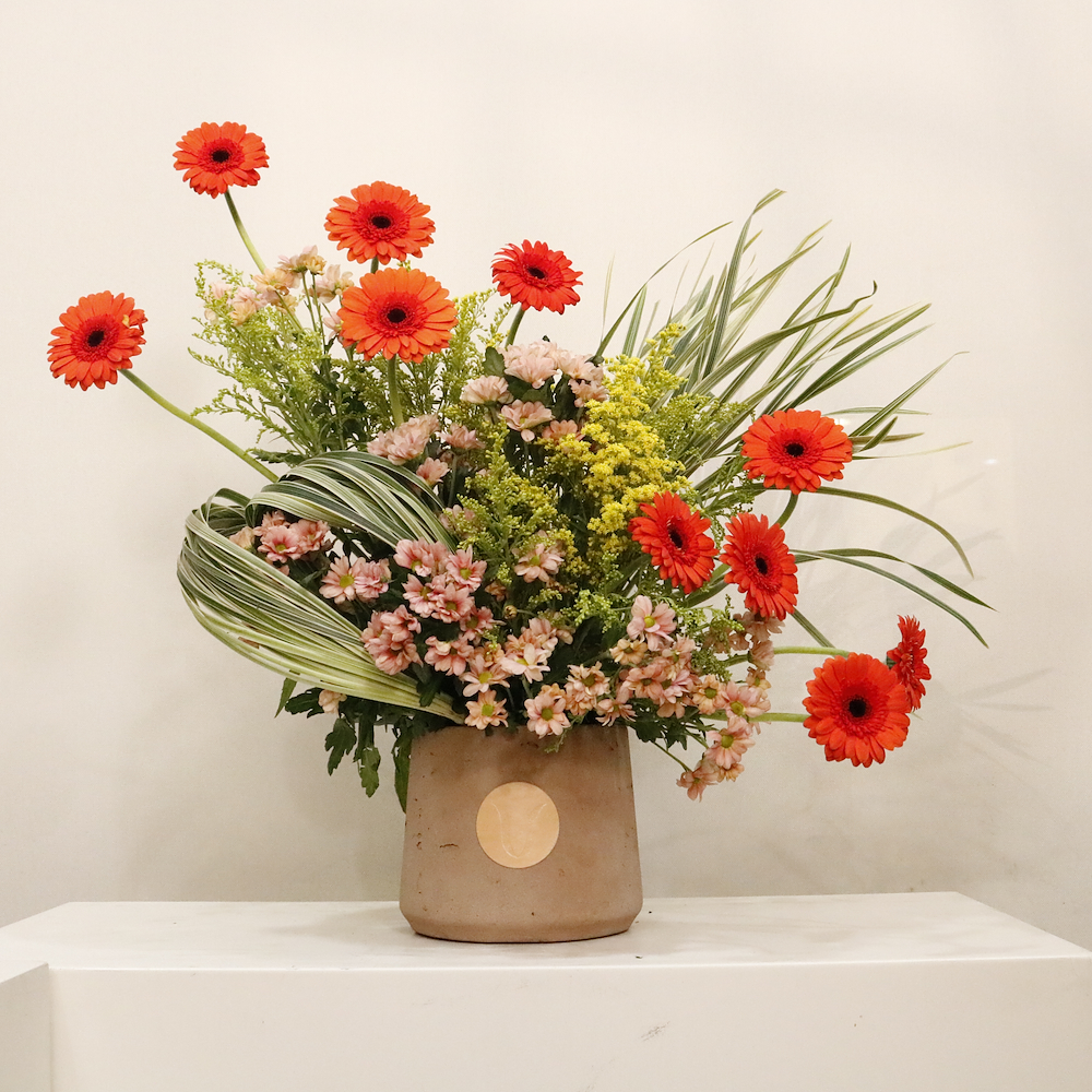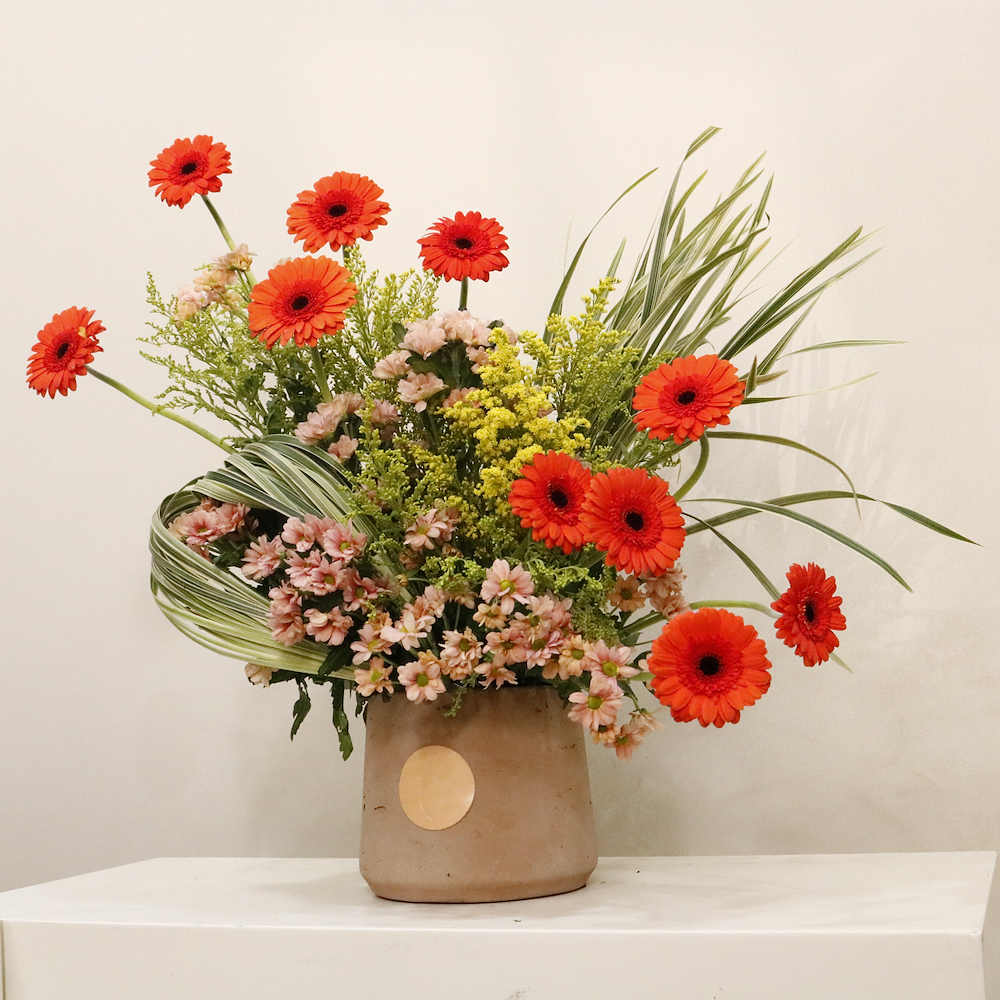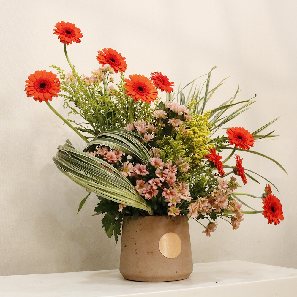 تحفة فنية من الزهور الفاخرة، تتألق بجمال زهور الجيربيرا والكريز المشرقة وتفاصيل نباتية عميقة. صمم هذا التنسيق الأنيق ليناسب أصحاب الذوق الرفيع.