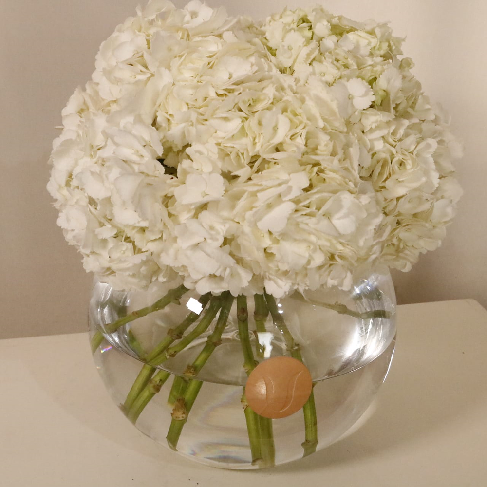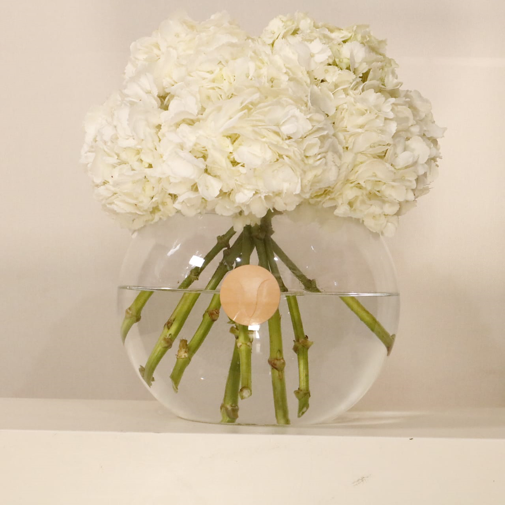 تنسيق فاخر يضم 10 زهور هايدرينجا بيضاء في فازة زجاجية شفافة تفيض بالأناقة. تصميم كلاسيكي يجسد النقاء والجمال الهادئ، مما يجعله الهدية المثالية للتعبير عن التقدير والذوق الرفيع.