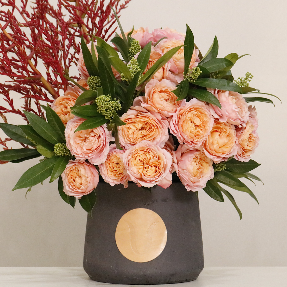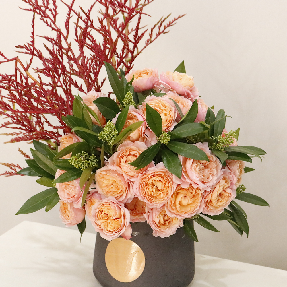 تنسيق أنيق من زهور الجوري الخوخية بلمسات دافئة، يعكس النعومة والأناقة العصرية.