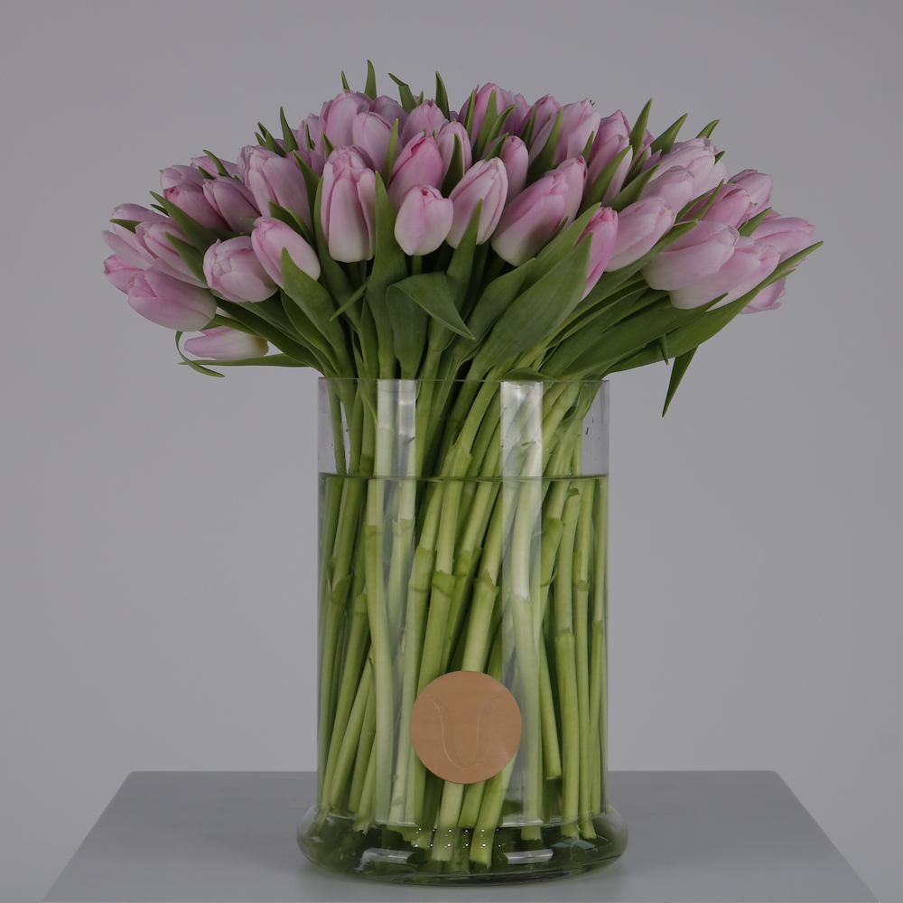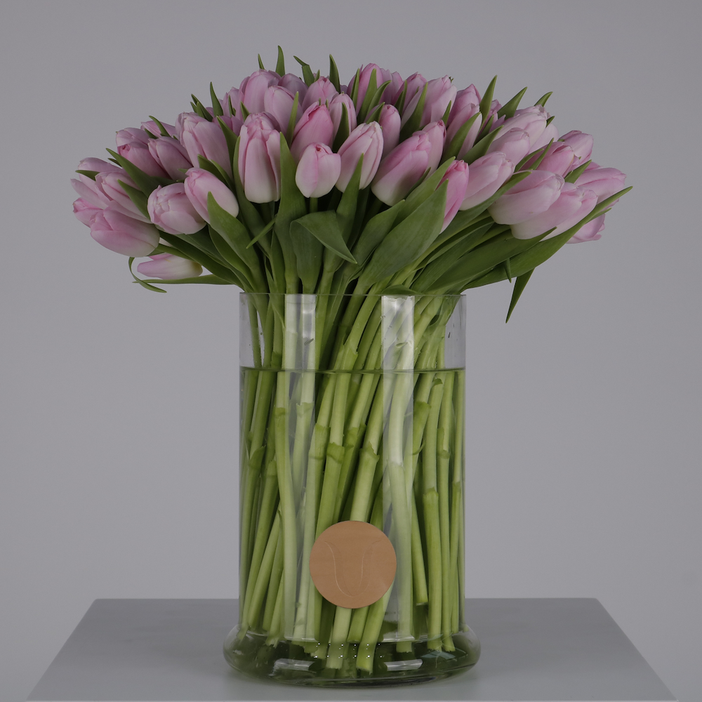 فازة تخطف الأنفاس تضم 70 زهرة توليب وردية، تنبض بالأناقة والرقة. سيمفونية من الجمال والمشاعر تنشر الدفء والحنان.