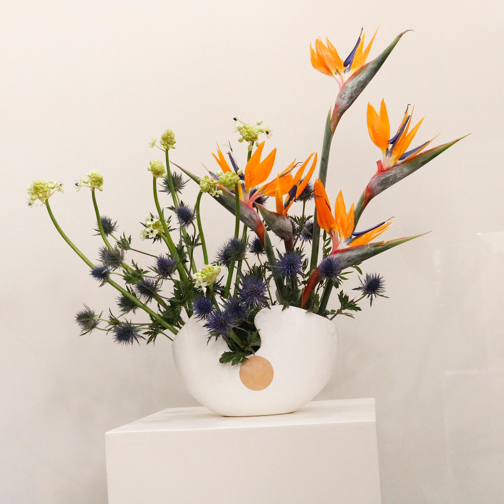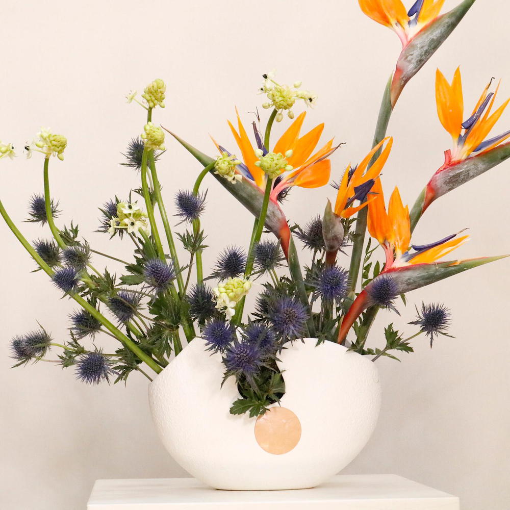 فازة فاخرة مليئة بأزهار بيرد اوف بارادايس ولمسات ناعمة من الأوراق الخضراء.