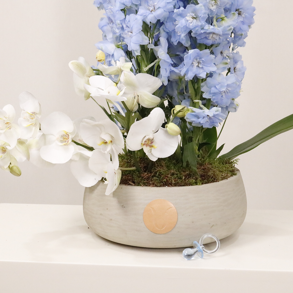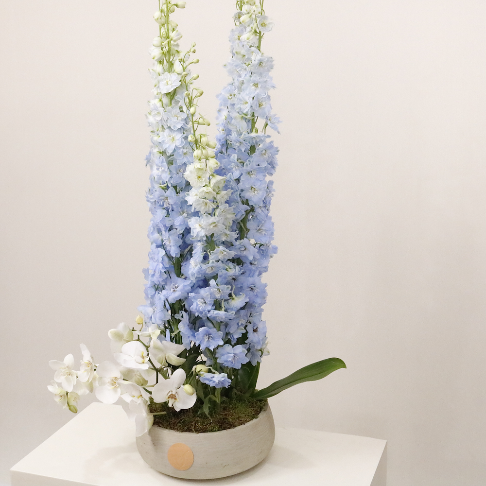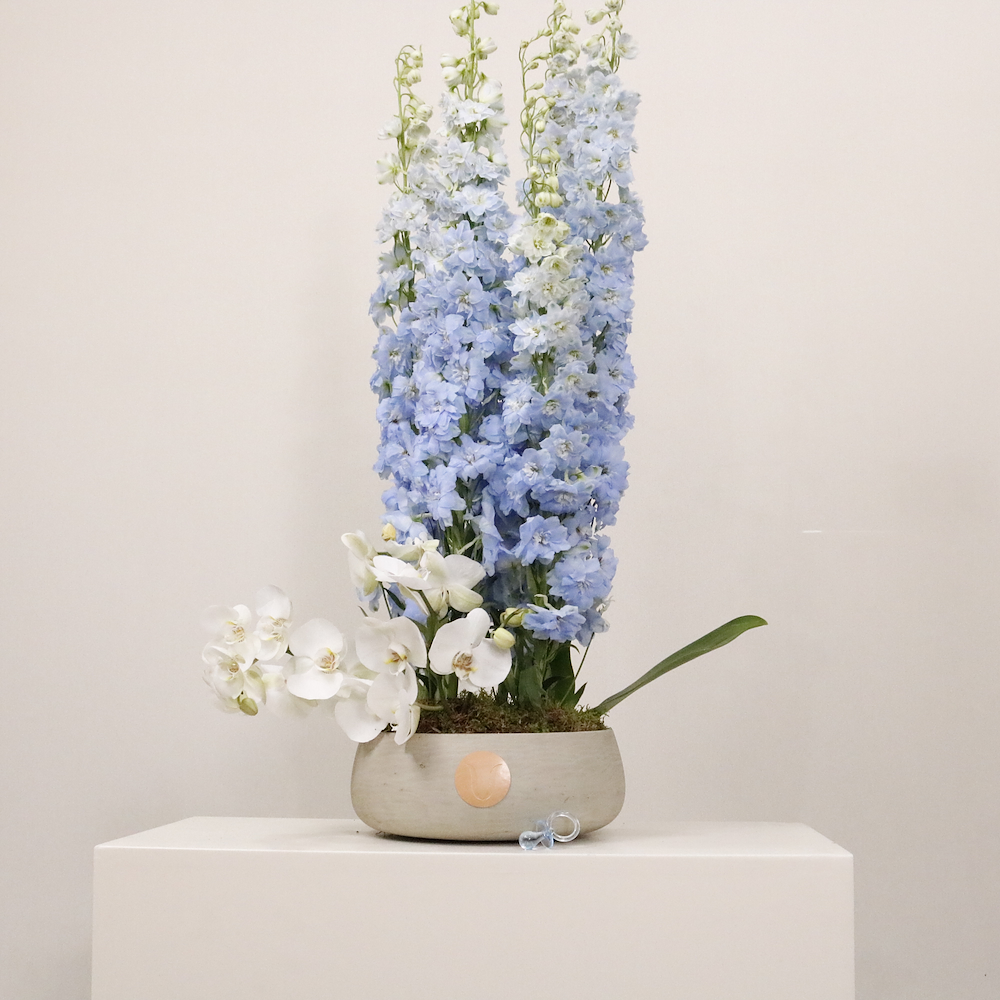 باققة هادئة من أزهار الدلفينيوم باللون الأزرق وأوركيد البيضاء، مزيج من الهدوء والنقاء للاحتفال بالبدايات الجديدة.