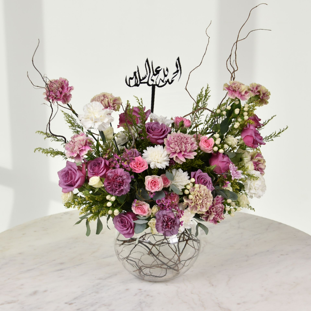 فازة زجاجية تحتوي على زهور الجوري، الكارنيشن، البيبي جوري والهايبريكم.