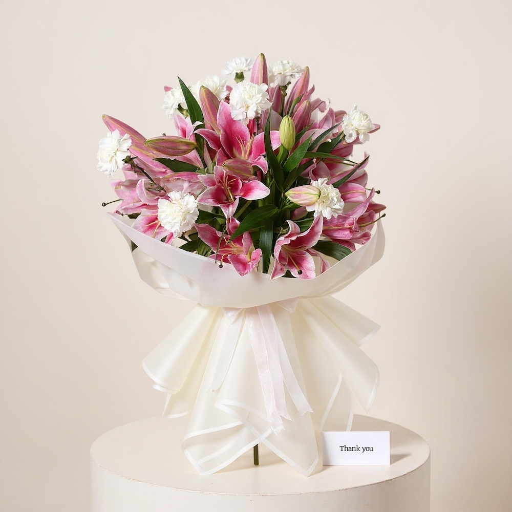 بوكس مليئ بأزهار البيبي جوري، الكارنيشن والكازابلانكا ليليوم.