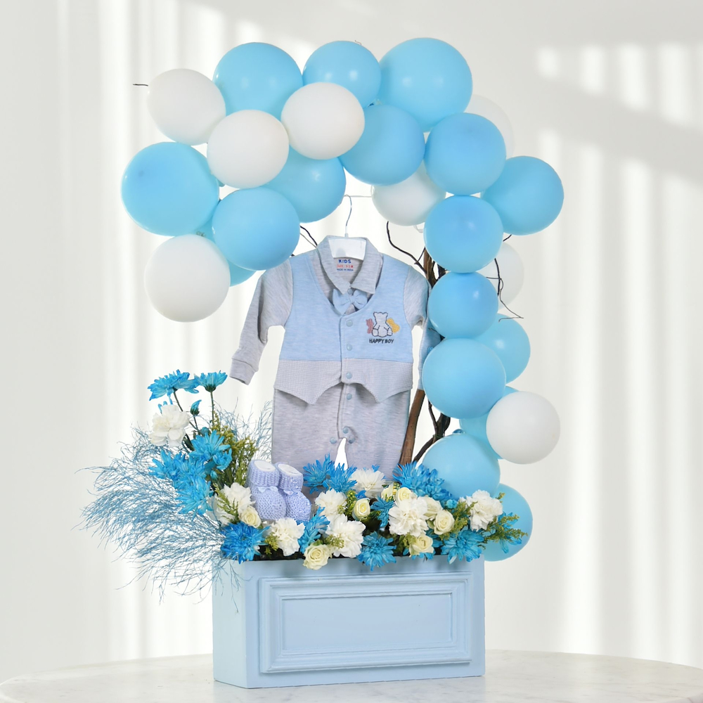بوكس باللون الأزرق فاخر مليئ بأزهار البيبي روز والكارنيشن مع بدلة الطفلة والبالونات.