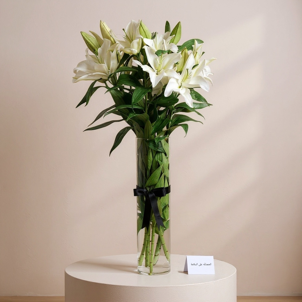 فازة تحتوي على زهور الكزابلانكا ذات الجمال الأخاذ والرائحة العطرة التي تملأ المكان.