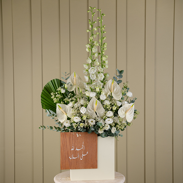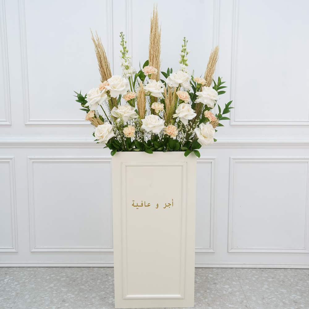علبة منسقة بأناقة بزهور الدلفينيوم والهايدرينجا. هدية تضفي لمسة من الفخامة والجمال.