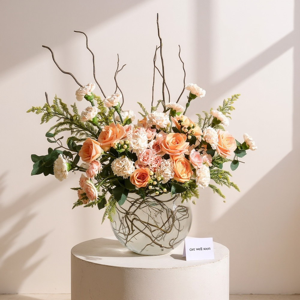 سحر زهور الكارنيشن وجمال الجوري المميز في فازة زجاجية مرتبة بأوراق السوليداغو الجميلة.