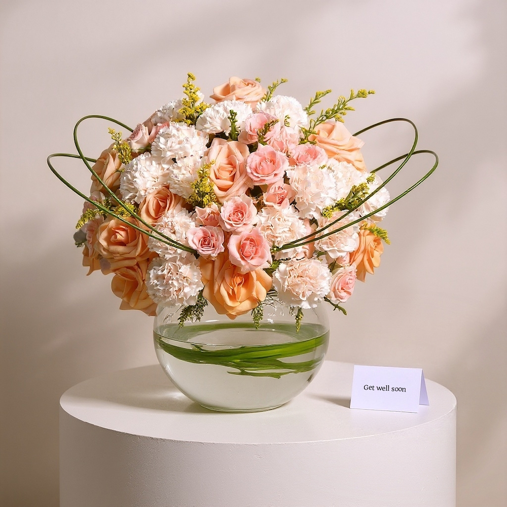 سحر زهور الكارنيشن وجمال الجوري المميز في فازة زجاجية مرتبة بأوراق السوليداغو الجميلة.