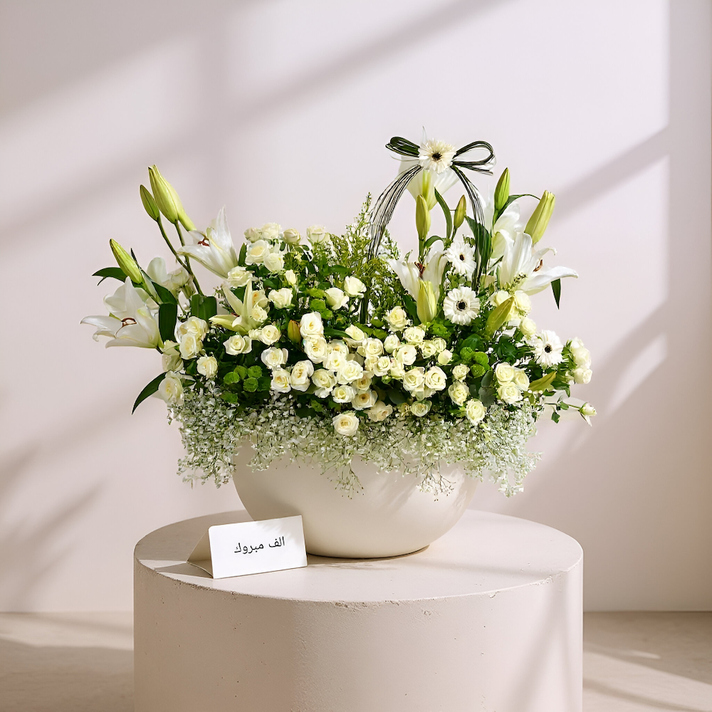 باقة تحتوي على زهور الكازابلانكا، الجيربيرا والبيبي جوري العطرية. هدية تضفي لمسة من الفخامة.