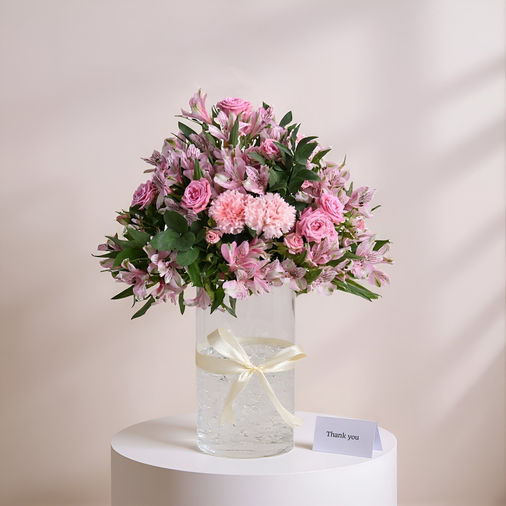 فازة زجاجية مرتبة بزهور الألستروميريا، الكارنيشن والبيبي جوري ومغلفة بشريطة رائعة.