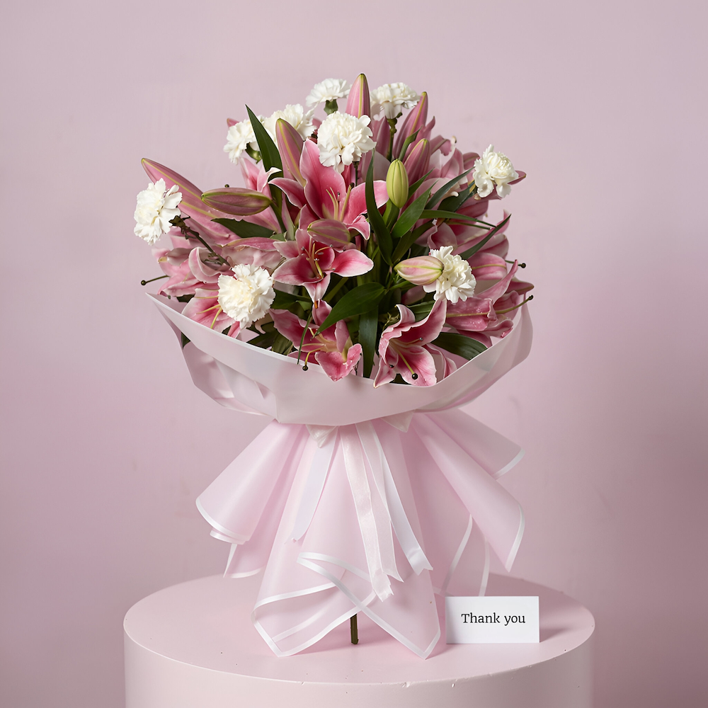 باقة يد تتميز بأزهار الكازابلانكا العطرية والكارنيشن.