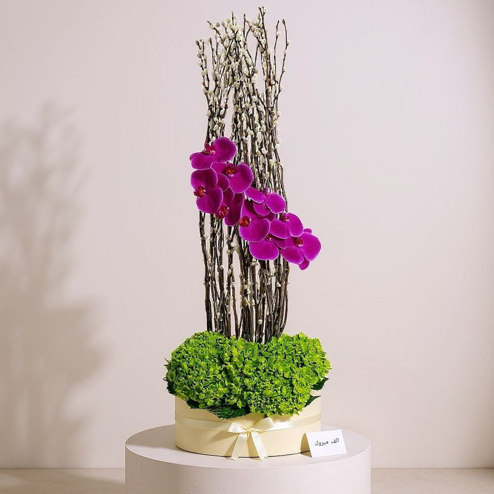 علبة تحتوي على زهور الفالانوبسيس والهايدرينجا المميزة، بتصميم فريد يعكس الذوق الرفيع.