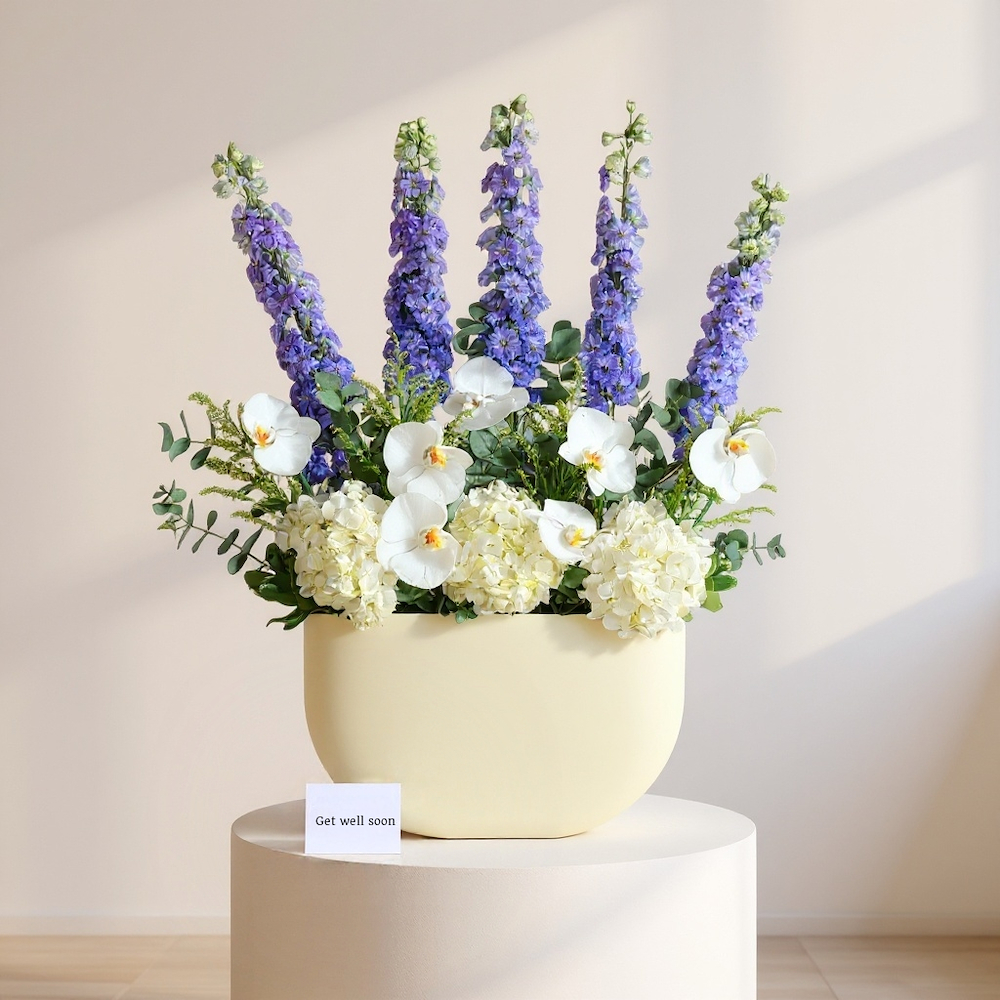 صندوق مرتب بزهور الدلفينيوم الأرجوانية، الهايدرينجا الناعمة الأوركيد الأنيقة. تنسيق بسيط ولكنه جميل يبرز السحر الطبيعي للزهور.