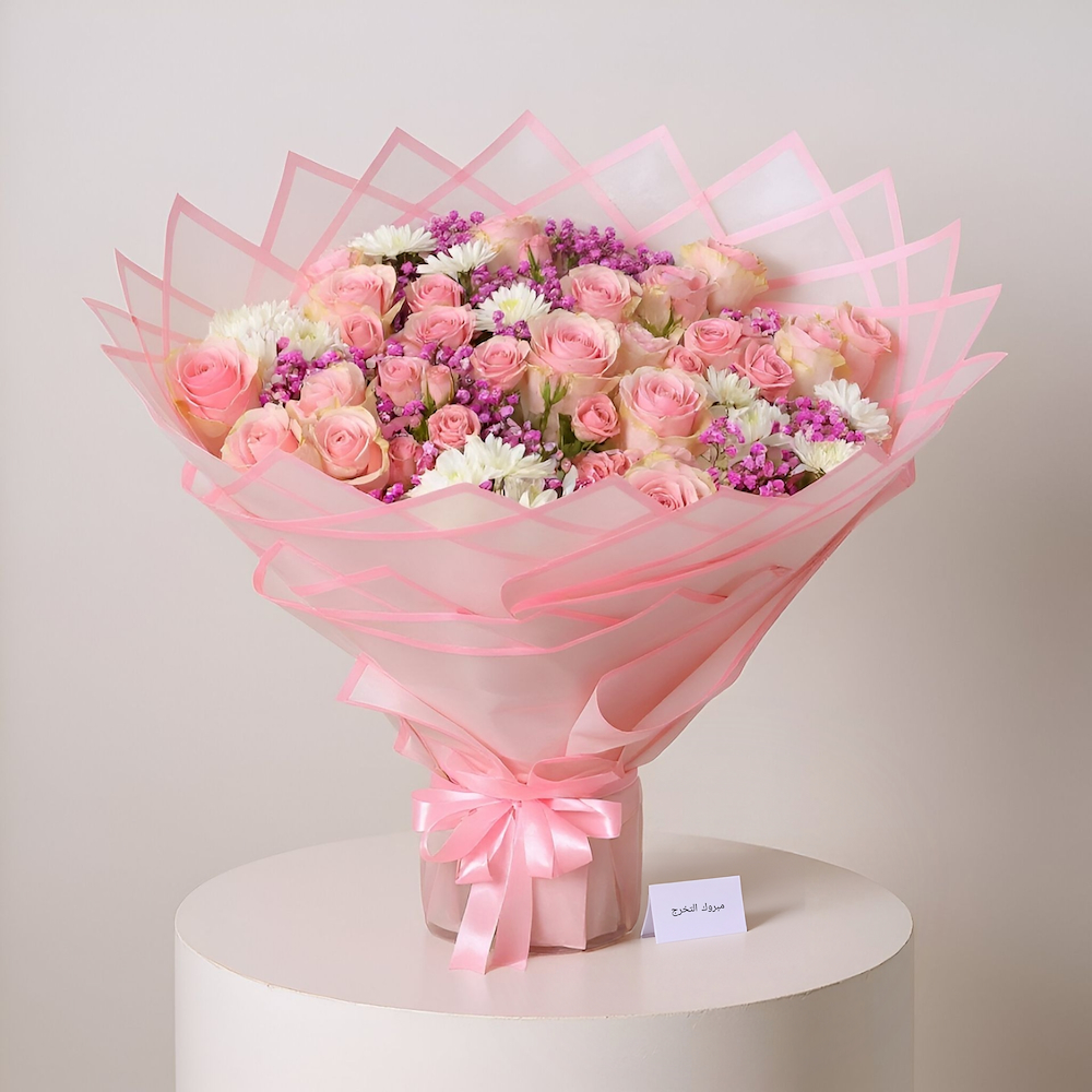 باقة بتغليف وردي تحتوي على زهور الجوري، الجبسوفيلا، الكريز والبيبي جوري. هدية قيمة لمشاركة الفرحة.