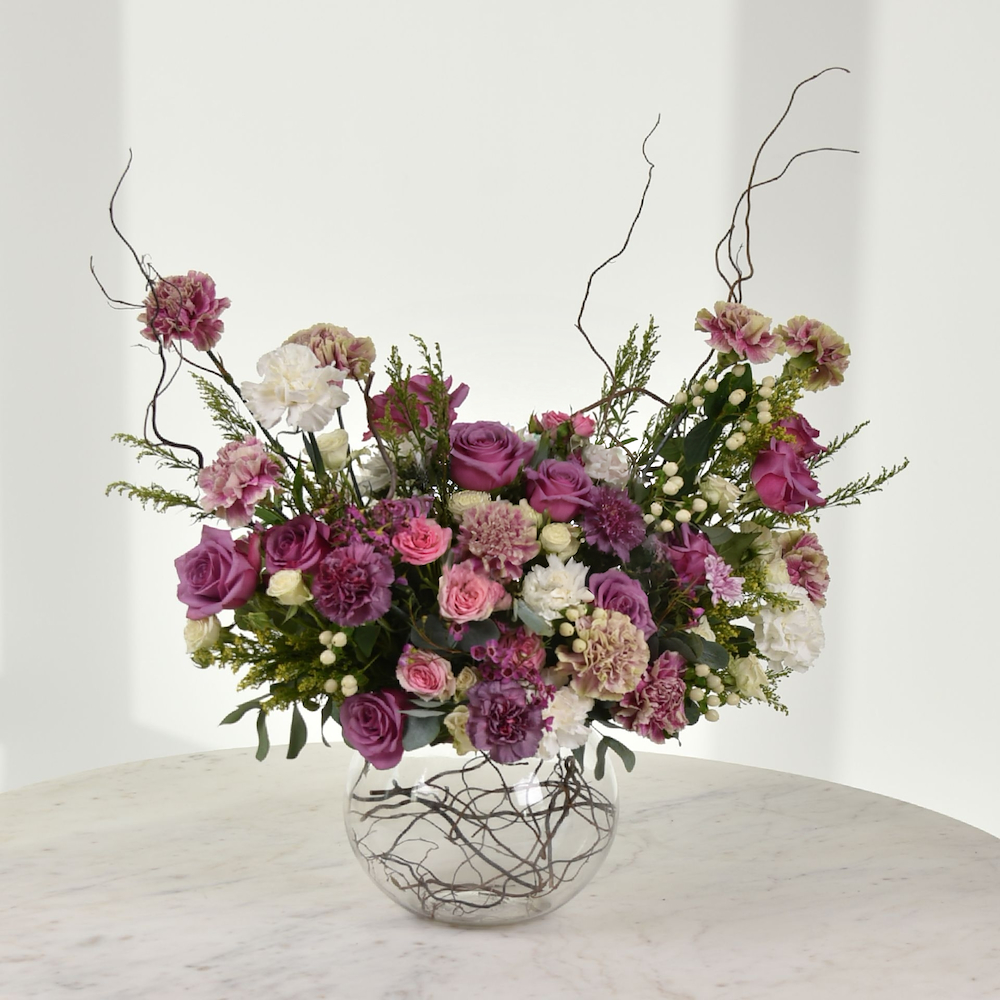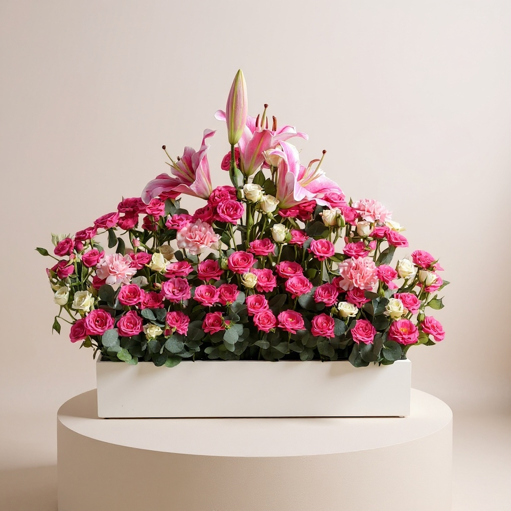 علبة تحتوي على زهور البيبي جوري، الكازابلانكا والكارنيشن العطرية.