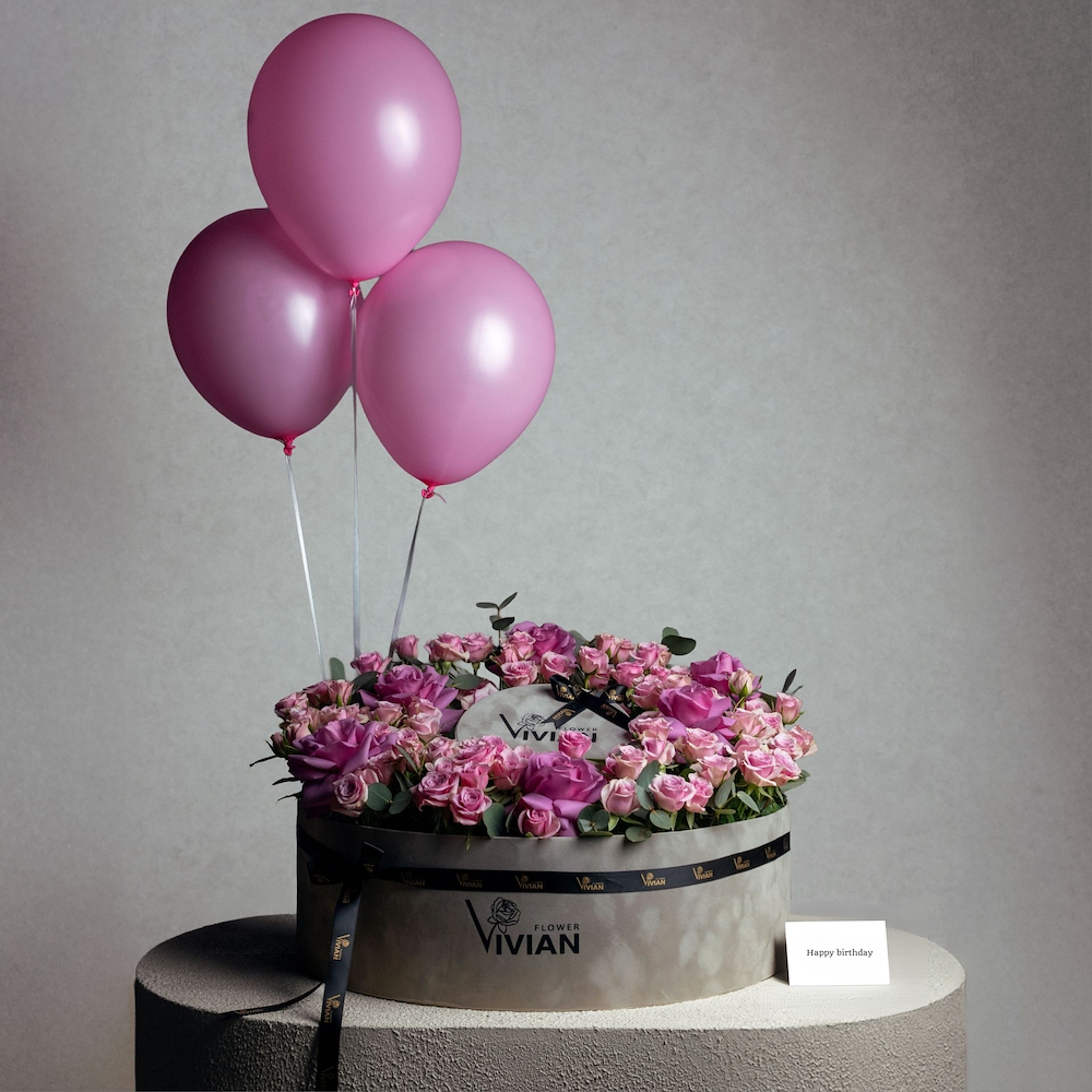 علبة مرتبة بزهور الجوري و البيبي جوري الأرجوانية تتوسطها الشوكولاتة اللذيذة والبالونات. هدية مثالية لمشاركة الفرحة.