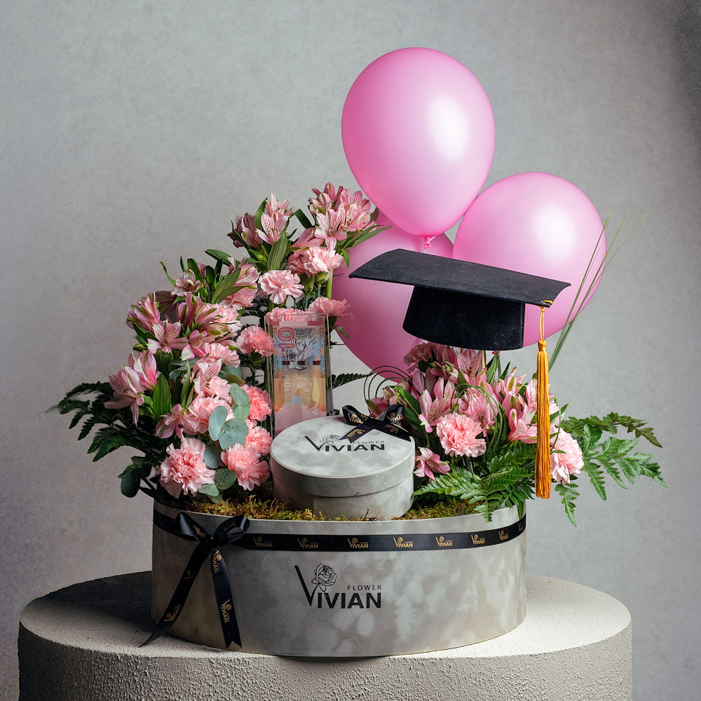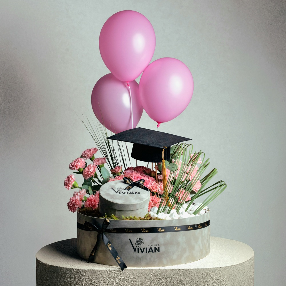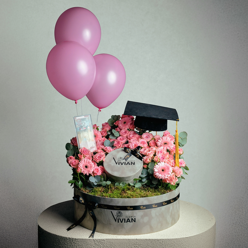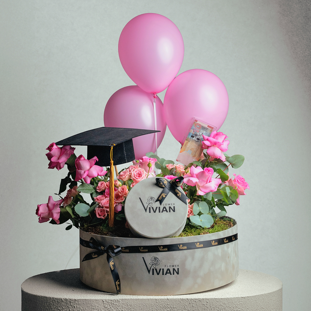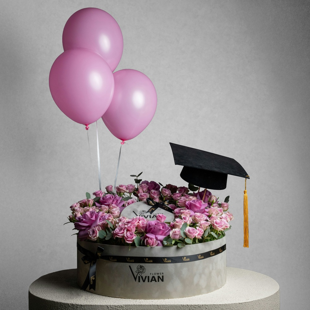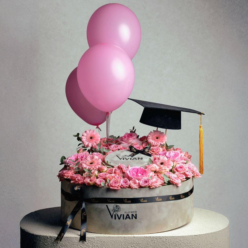 احتفال التخرج في علبة مخملية مرتبة بزهور الجوري والبيبي جوري تتوسطها علبة الشوكولاتة اللذيذة وتقدم مع البالونات.