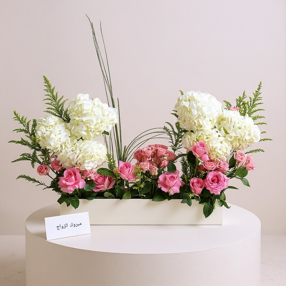 بوكس مليئ بأزهار الكوبية، تحيطها أوراق السوليداقو وأزهار الجوري.