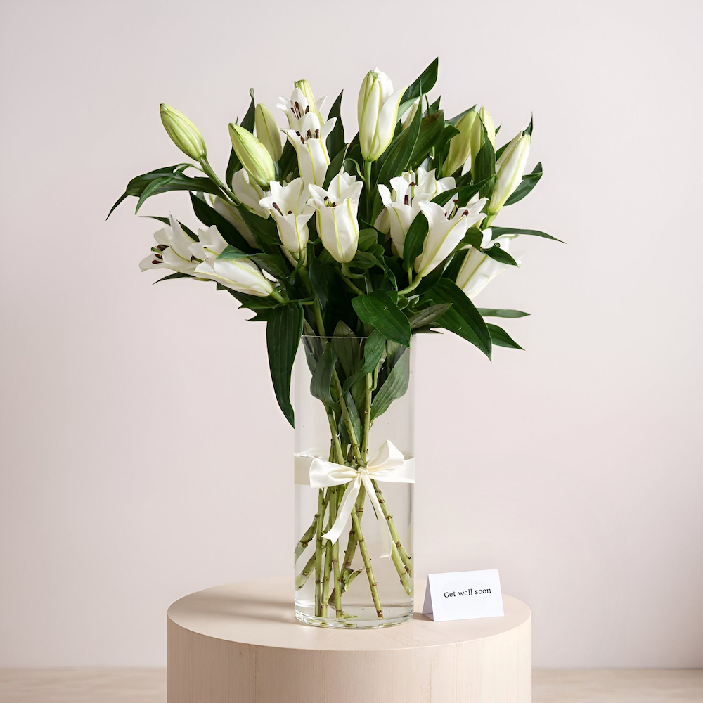 فازة زجاجية مرتبة بزهور الكازابلانكا العطرية التي تملئ المكان برائحة الزهور.