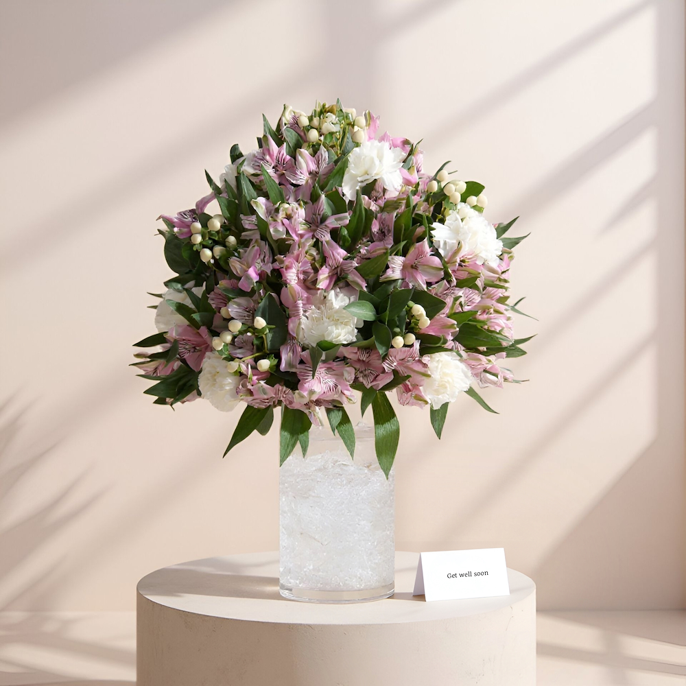 فازة زجاجية مرتبة بزهور بالألستروميريا، الكارنيشن والهايبريكم.