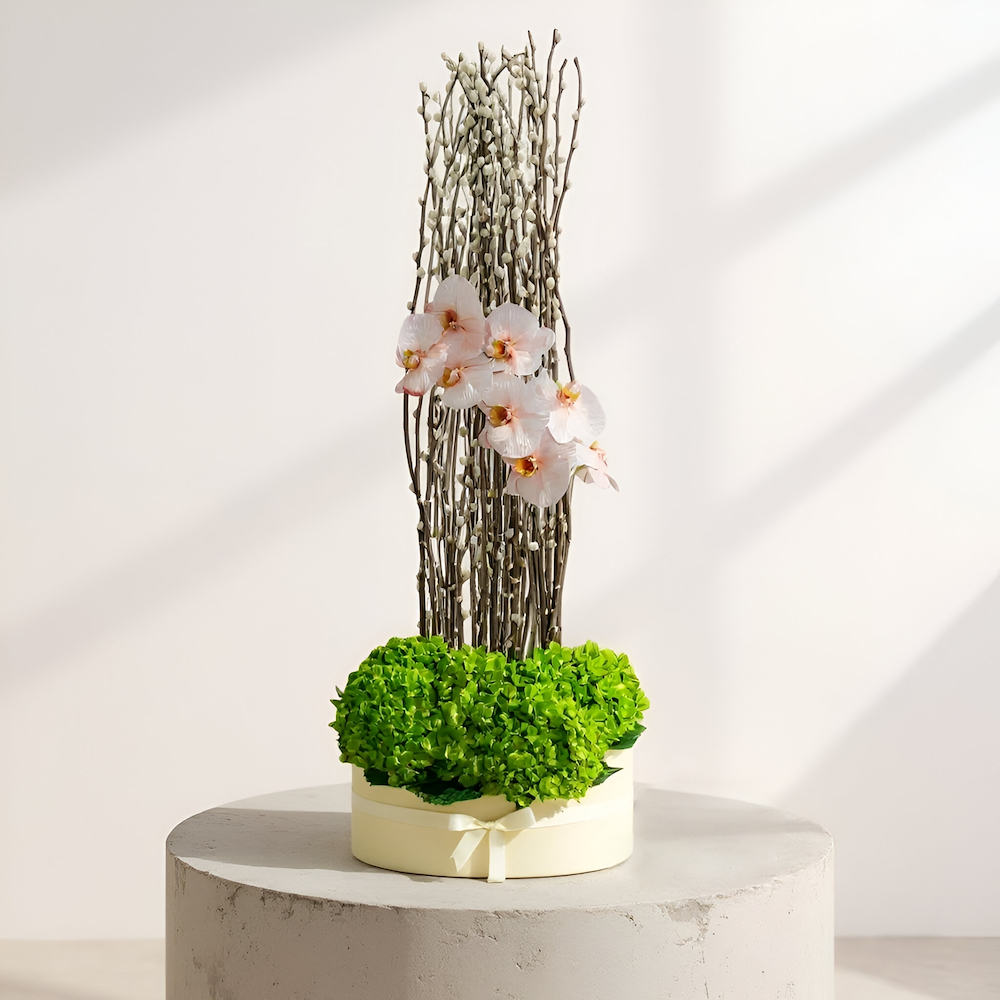 علبة تحتوي على زهور الفيلانوبسيس والهايدرينجا المرتبة بتنسيق حصري.